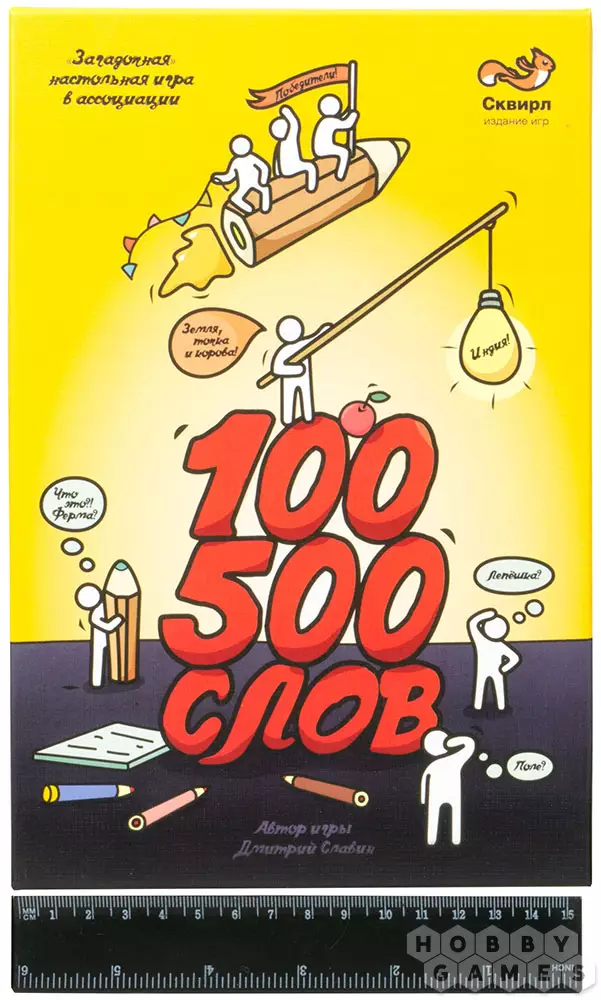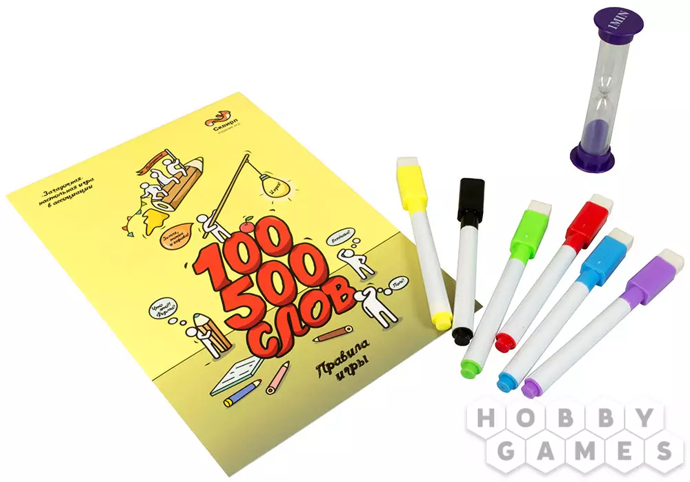 Наверное, каждый из нас играл в ассоциации, "100500 слов" развивает эту концепцию: у каждого участника есть по шесть карт, на которых написаны разные понятия. В свой ход им нужно выбрать несколько из них, выложить на стол и придумать объединяющую эти слова ассоциацию. Остальным игрокам требуется понять, как рассуждал ведущий: простая ли тут логика? Или, может быть, слова объединены его интересами? А может, он выложил их в определённом порядке, чтобы намекнуть на любимый фильм?