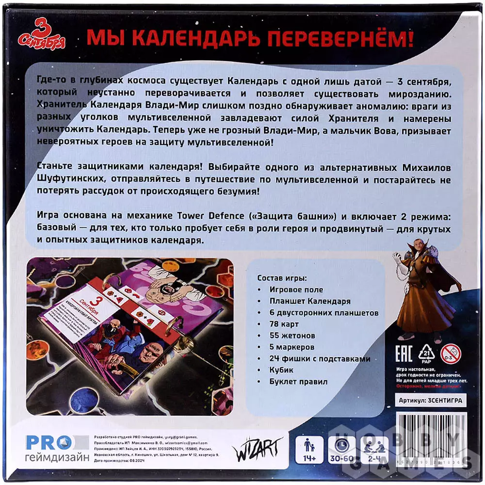 "3 сентября" – это настольная стратегическая игра в жанре tower defense, или "защиты башни", главная цель в которой – уничтожить врагов прежде, чем они пересекут карту (в нашем случае Календарь). В игре существует два режима: базовый, отличный вариант для начала знакомства с миром Михаила Шуфутинского, и продвинутый – для отчаянных ребят на опыте, у которых монстры умирают с одного знатного чапалаха. Открывайте же портал в осень и отправляйтесь спасать Календарь!
