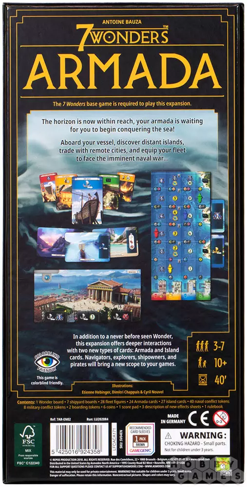 7 Wonders: Armada ("7 Чудес: Армада") – это крупное дополнение для настольной игры "7 Чудес", которое можно сочетать с другими дополнениями в любой комбинации. Каждый игрок получит специальное морское поле в дополнение к своей доске чудес. Также внутри вы найдёте новые красные, зелёные, жёлтые и синие карты для замешивания в колоду. Каждый раз, играя карты этих цветов, вы дополнительно можете заплатить стоимость, указанную на вашем морском поле, чтобы продвинуть корабль соответствующего цвета вверх по треку, получая особые бонусы. Приведите свою нацию к победе на морях вместе дополнением Armada!