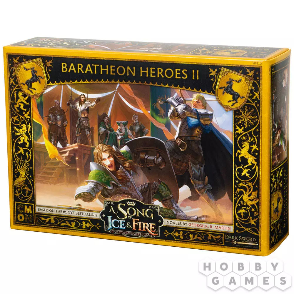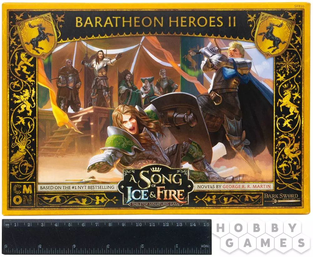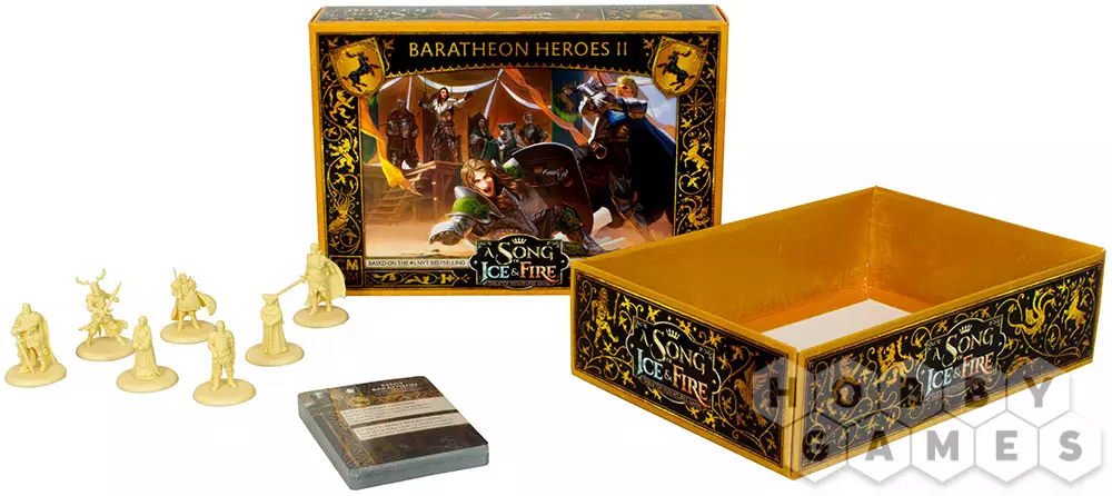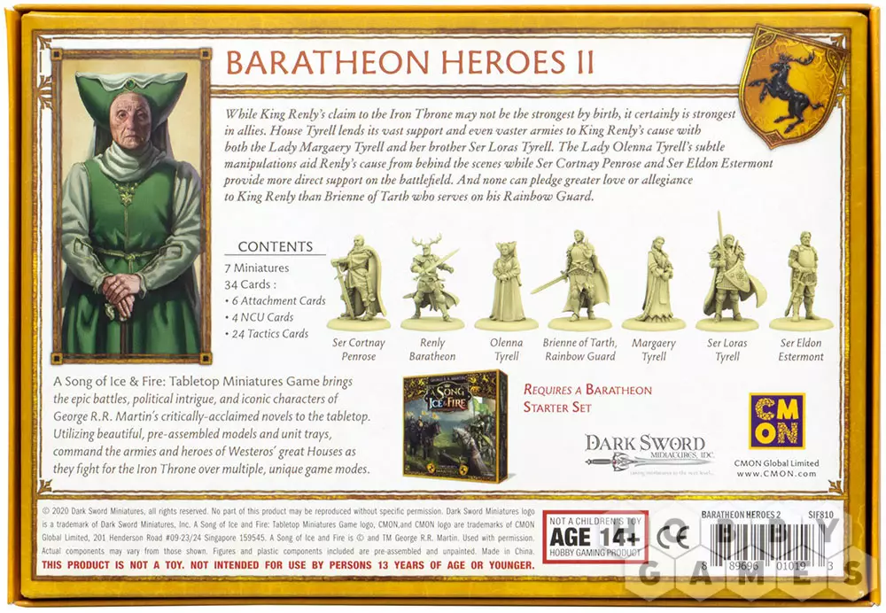 Набор Baratheon Heroes #2 даёт сторонникам Дома Баратеонов великолепную возможность сделать выбор между Станнисом и Ренли и настроить свои войска в соответствии с принятым решением и предпочитаемым стилем игры. В этом помогут входящие в состав набора карты вложений и тактики, а ещё – новые небоевые персонажи, в том числе и коварная Оленна Тирелл со своей внучкой Маргери, женой Ренли.