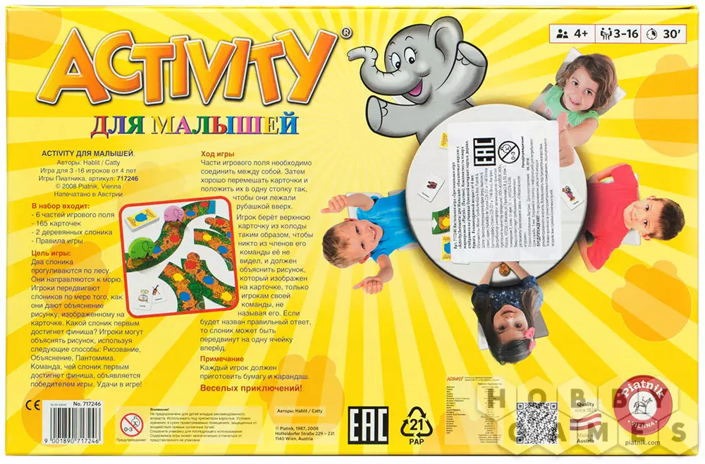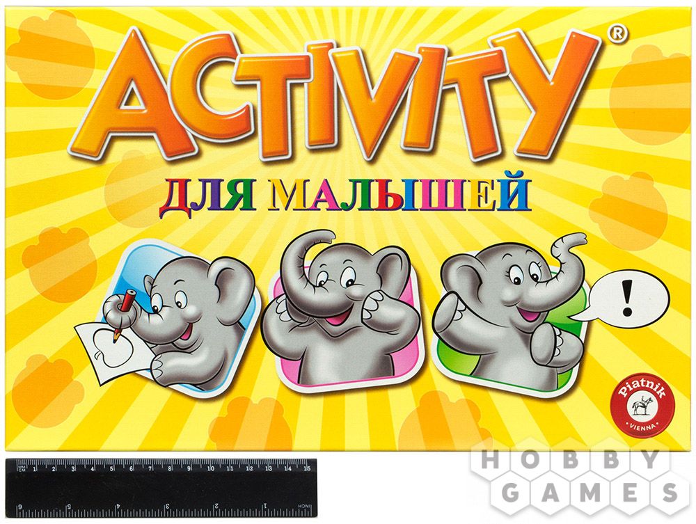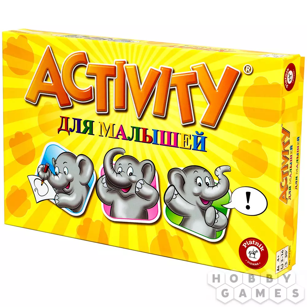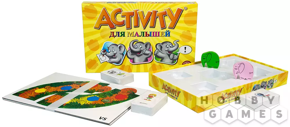 Эта версия "Активити" для детей подойдет просто наилучшим образом! Ведь правила и задания упростились. Теперь упор сделан не на соревновательную часть, а на обучающее-развивающую. Игра отлично подойдет для самых маленьких игроков: яркий дизайн, мультяшные рисунки и фишки-слоники которые "путешествует" по игровому полю. Все это точно не оставит вашего ребенка равнодушным. Смысл настольной игры "Activity для малышей" в том, чтобы объяснять загаданные слова самыми необычными способами (рисованием, с помощью пантомимы и синонимов). За каждое правильное угаданное слово ребенок продвигает слоника вперед по полю.