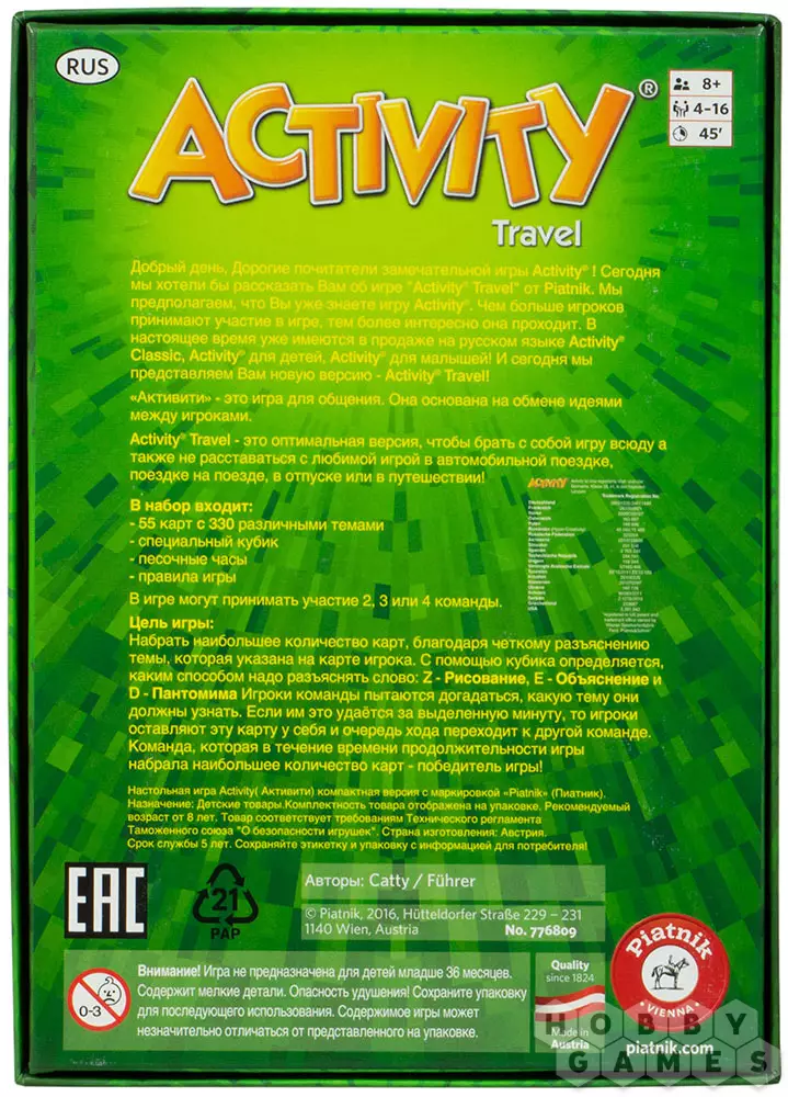 Activity Travel – это оптимальная версия популярной игры, которою легко взять с собой, куда бы вы ни пошли. Теперь можно не расставаться с любимой игрой в путешествии на автомобиле, поездке на поезде, или в отпуске! В игре могут принимать участие 2, 3 или 4 команды.
