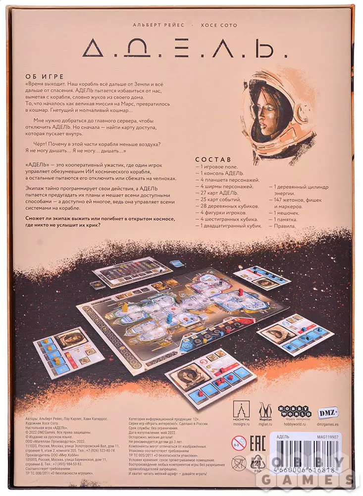 "А.Д.Е.Л.Ь." – это полукооперативная игра, посвящённая выживанию на космическом корабле. Одному игроку предстоит взять на себя управление системами корабля и противостоять остальным, предугадывая действия игроков за членов экипажа. У каждого космонавта будет своя способность, стартовый предмет и уникальные характеристики, которые нужно будет учитывать при планировании действий. Решать, что делать в этом ходу, игроки за космонавтов будут с помощью кубиков действий: их надо распределять за специальными экранами, чтобы скрыть свои намерения от бдительного взгляда АДЕЛЬ.