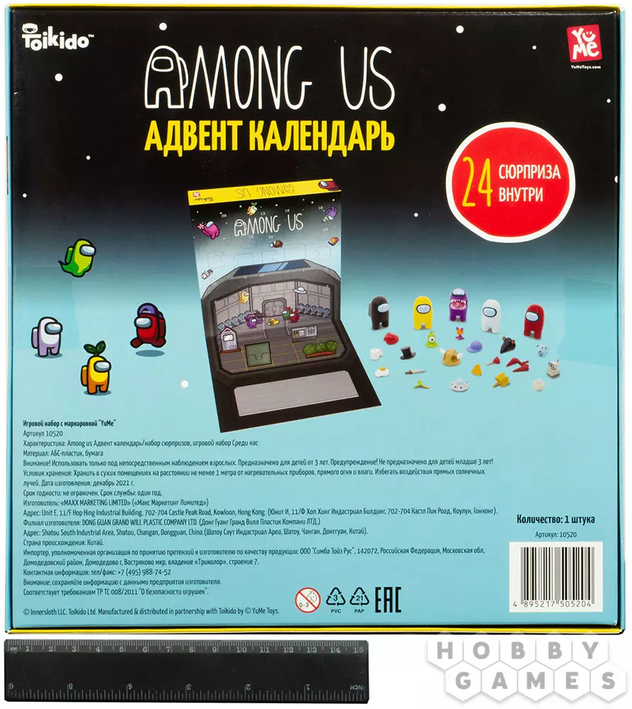 В упаковке находятся 24 сюрприза: 5 фигурок героев по игре Among Us и аксессуары для них. В каждой упаковке они разные, что делает их ещё и предметом для коллекционирования.
