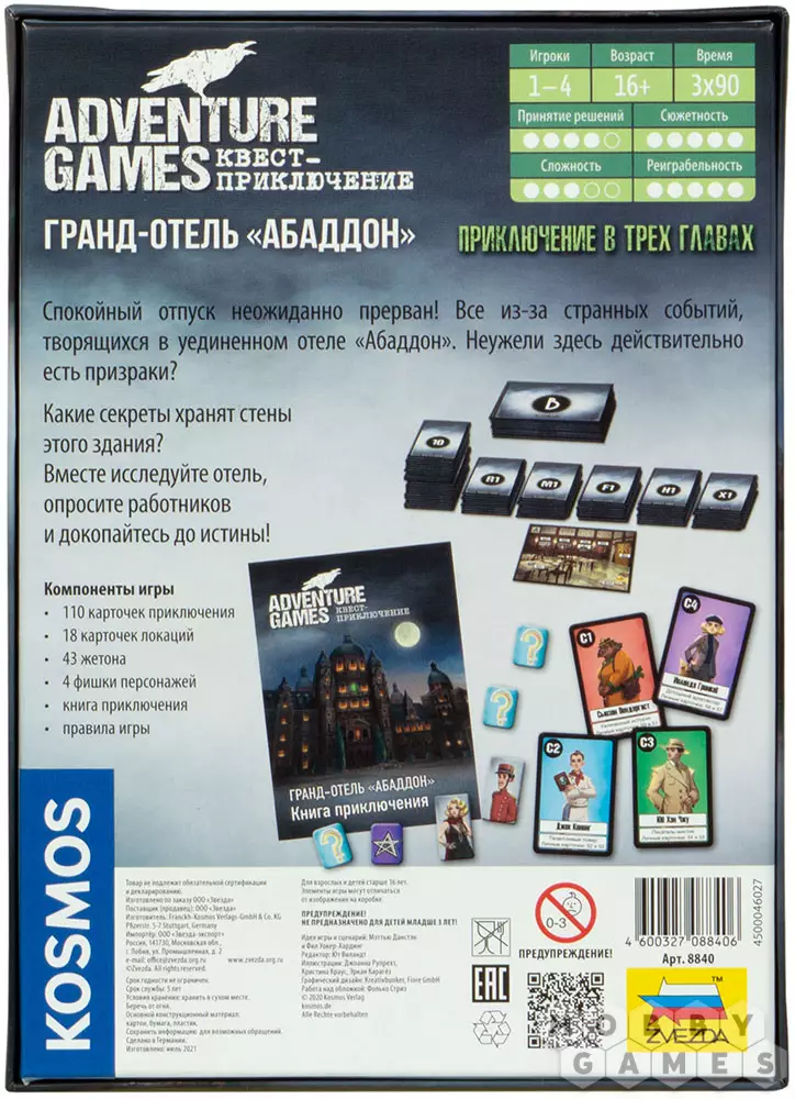 Старинный отель, призраки, тёмные коридоры, тесные номера, ковры, в которых ноги будто бы вязнут... Классическая локация для хоррора, неважно, в формате фильма, игры или книги. Теперь вам предстоит расследовать жуткие тайны старой гостиницы и её призраков и в новой части серии настольных квестов Adventure Games.
