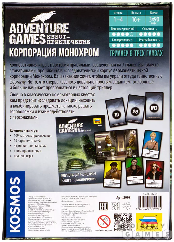 Кооперативные игры из серии Adventure Games основаны на механике классических компьютерных квестов, переведённых в настольный формат. Сюжет игры состоит из 3 глав, на протяжении которых вы будете перемещаться по разным локациям, исследовать их, комбинировать обнаруженные предметы, решать увлекательные логические головоломки и взаимодействовать с сюжетными персонажами. Всё это поможет вам провести несколько незабываемых часов в компании друзей и найти ключ к главной загадке игры.