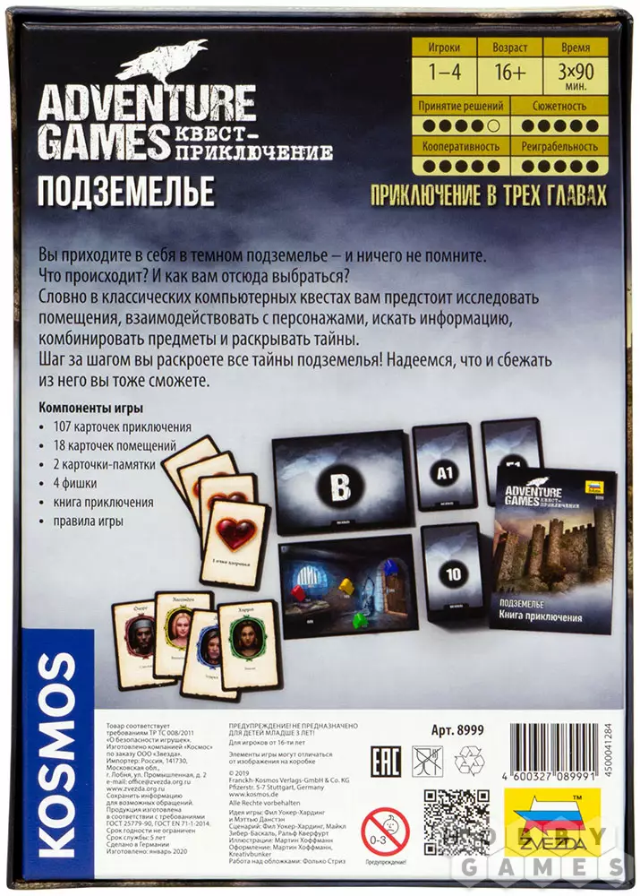 Кооперативные игры из серии Adventure Games основаны на механике классических компьютерных квестов, переведённых в настольный формат. Сюжет игры состоит из 3 глав, на протяжении которых вы будете перемещаться по разным локациям, исследовать их, комбинировать обнаруженные предметы, решать увлекательные логические головоломки и взаимодействовать с сюжетными персонажами. Всё это поможет вам провести несколько незабываемых часов в компании друзей и найти ключ к главной загадке игры.