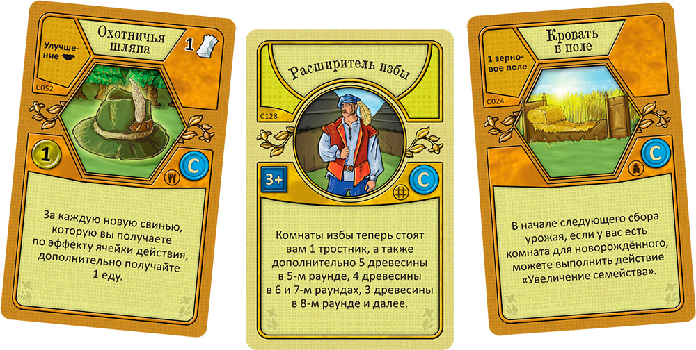 В процессе игры ваше фермерское хозяйство будет расти, вы обзаведётесь животными, на вспаханных полях вырастут зерно и овощи, ваш дом станет больше и сможет вмещать новых членов семьи, которых также придётся кормить. С другой стороны, чем больше ваша семья, тем больше дел по хозяйству вы сможете выполнить! Семью необходимо накормить в конце раунда, который заканчивается Урожаем. Таких раундов в игре шесть. Во время этой фазы все игроки собирают урожай с полей, увеличивают поголовье своего скота и кормят членов своей семьи.