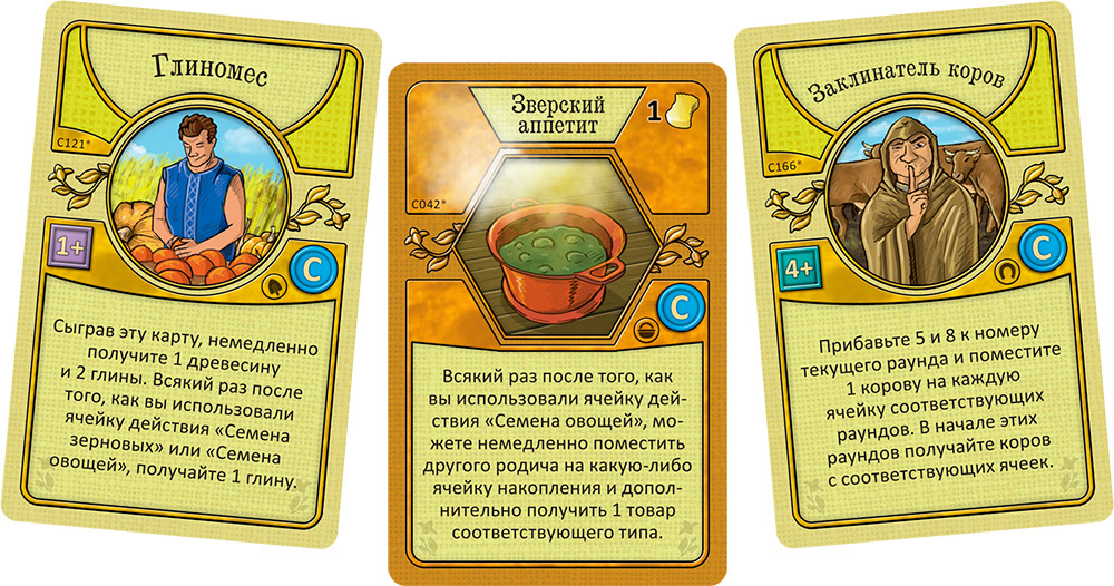 В процессе игры ваше фермерское хозяйство будет расти, вы обзаведётесь животными, на вспаханных полях вырастут зерно и овощи, ваш дом станет больше и сможет вмещать новых членов семьи, которых также придётся кормить. С другой стороны, чем больше ваша семья, тем больше дел по хозяйству вы сможете выполнить! Семью необходимо накормить в конце раунда, который заканчивается Урожаем. Таких раундов в игре шесть. Во время этой фазы все игроки собирают урожай с полей, увеличивают поголовье своего скота и кормят членов своей семьи.