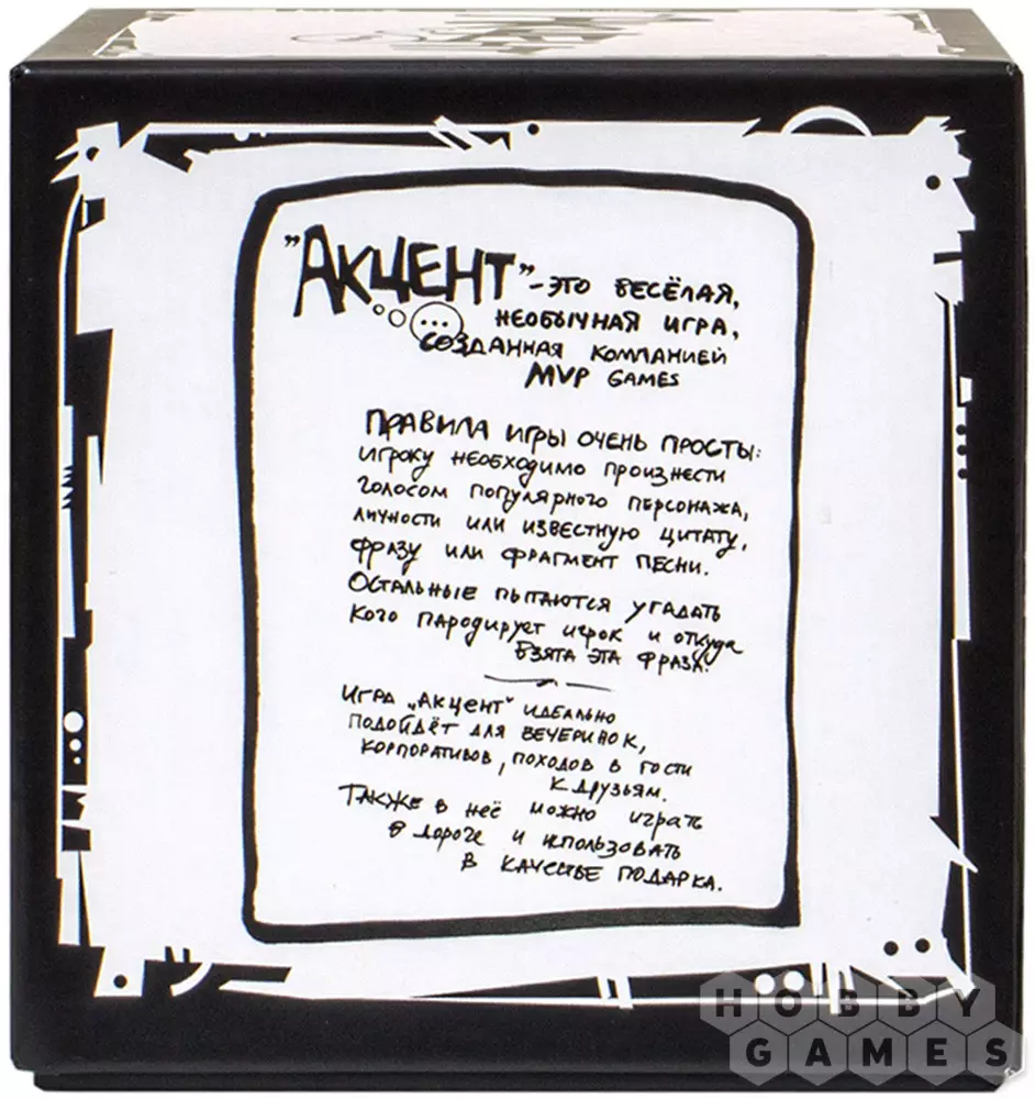 "Акцент" – это весёлая настольная игра, которая проверит ваше актёрское и ораторское мастерство. Игра создана тремя талантливыми отечественными разработчиками и до краёв наполнена отсылками к популярной культуре.