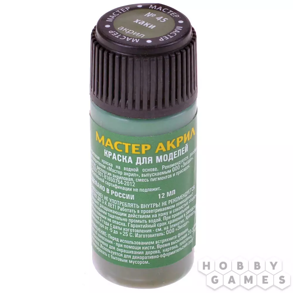 "Мастер акрил" от компании Zvezda – это акриловые краски на водной основе, полностью готовые для работы. Просто разбавьте их водой, и принимайтесь за дело! Они подойдут для окрашивания моделей из любого материала, будь то пластик, дерево, бумага или металл. Использовать краски можно как для окрашивания кистью, так и с помощью аэрографа, но для этого рекомендуется разбавить краски растворителем "Мастер акрил" от компании Zvezda.