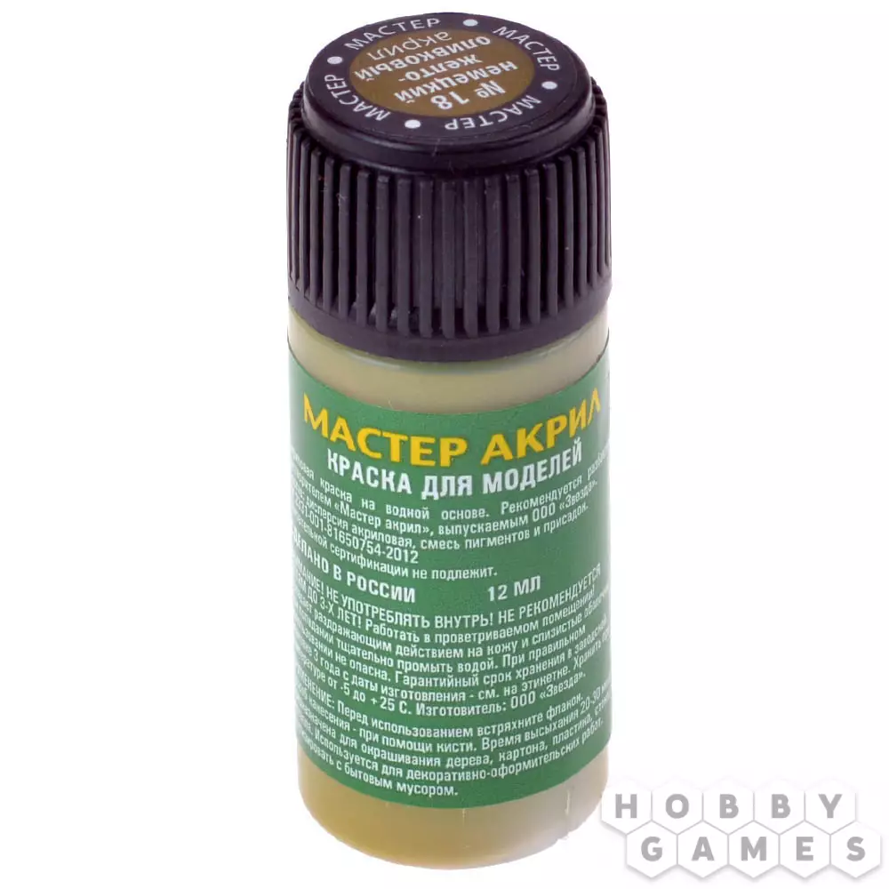 "Мастер акрил" от компании Zvezda – это акриловые краски на водной основе, полностью готовые для работы. Просто разбавьте их водой, и принимайтесь за дело! Они подойдут для окрашивания моделей из любого материала, будь то пластик, дерево, бумага или металл. Использовать краски можно как для окрашивания кистью, так и с помощью аэрографа, но для этого рекомендуется разбавить краски растворителем "Мастер акрил" от компании Zvezda.