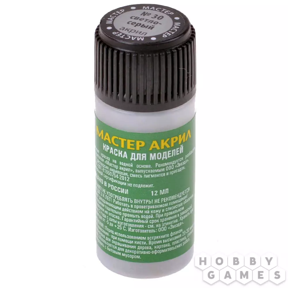 "Мастер акрил" от компании Zvezda – это акриловые краски на водной основе, полностью готовые для работы. Просто разбавьте их водой, и принимайтесь за дело! Они подойдут для окрашивания моделей из любого материала, будь то пластик, дерево, бумага или металл. Использовать краски можно как для окрашивания кистью, так и с помощью аэрографа, но для этого рекомендуется разбавить краски растворителем "Мастер акрил" от компании Zvezda.