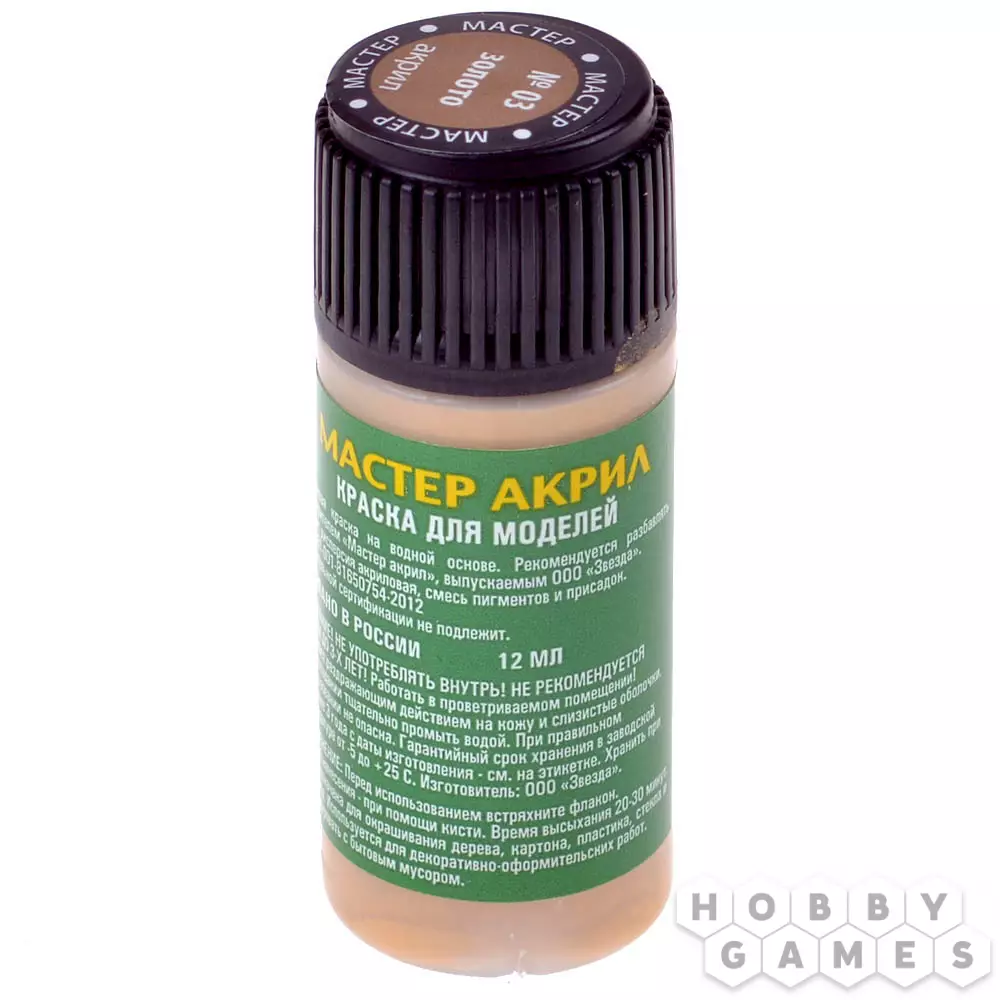 "Мастер акрил" от компании Zvezda – это акриловые краски на водной основе, полностью готовые для работы. Просто разбавьте их водой, и принимайтесь за дело! Они подойдут для окрашивания моделей из любого материала, будь то пластик, дерево, бумага или металл. Использовать краски можно как для окрашивания кистью, так и с помощью аэрографа, но для этого рекомендуется разбавить краски растворителем "Мастер акрил" от компании Zvezda.