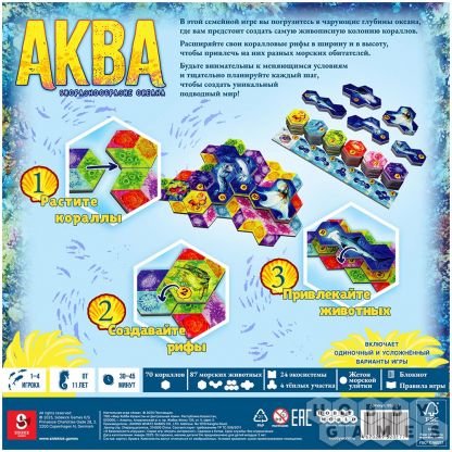 Это тактическая настолка о создании самой богатой и разнообразной коралловой колонии. Вы будете собирать из разноцветных жетонов коралловые рифы, привлекать очаровательных маленьких морских обитателей и создавать условия для появления величественных гигантов океана! Простые, но глубокие правила, потрясающие иллюстрации и успокаивающая морская тематика делают "Акву" идеальным выбором для семейного вечера и встреч с друзьями. Модульные поля, различные сценарии экосистем и несколько уровней сложности обеспечивают высокую реиграбельность, а тактическая глубина позволит каждому игроку разработать свою уникальную стратегию процветания подводного мира.