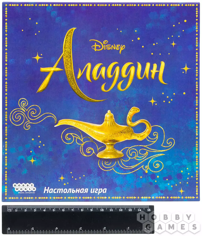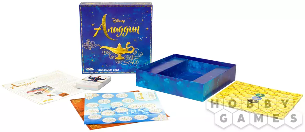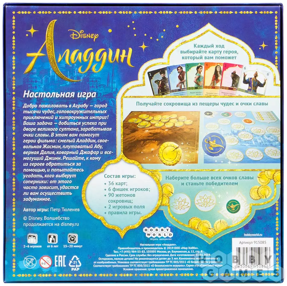 "Аладдин" – это динамичная и увлекательная карточная игра в мире любимого всеми "Аладдина"! Игра адаптирована к одноимённому фильму от компании "Дисней". Игрокам предстоит испытать себя в нелёгком деле по поиску славы и сокровищ. Для этого им нужно будет прибегнуть к помощи знакомых персонажей. Здесь сам благородный Аладдин и справедливая Жасмин, со своей подругой Далией. Тут и ловкая мартышка Абу, и смешливый весельчак Джинни! Без злодея Джафара дело не обойдётся, всё же он визирь при дворе султана!