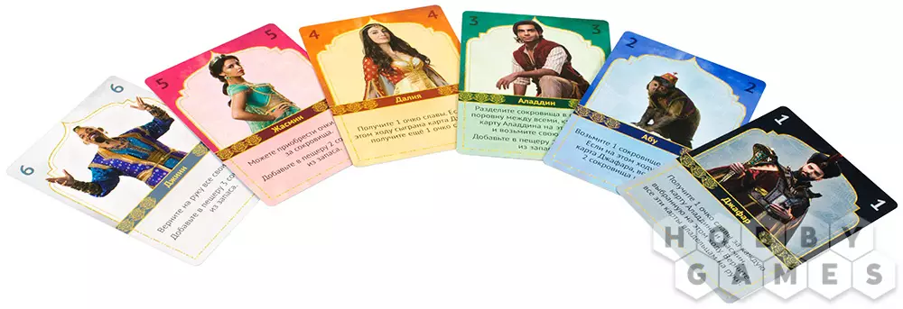 Каждый игрок получает набор из шести карт персонажей, каждая из которых обладает своим действием. Эти карты разыгрываются одновременно взакрытую всеми игроками и уже после этого переворачиваются. Все карты обладают различными номерами и активируются именно в этом порядке. Например, карта Джафара – №1, поэтому всегда разыгрывается самой первой. Разыгранные карты вернутся к вам обратно в руку только после того, как вы разыграете карту номер шесть с любимым Джинни!