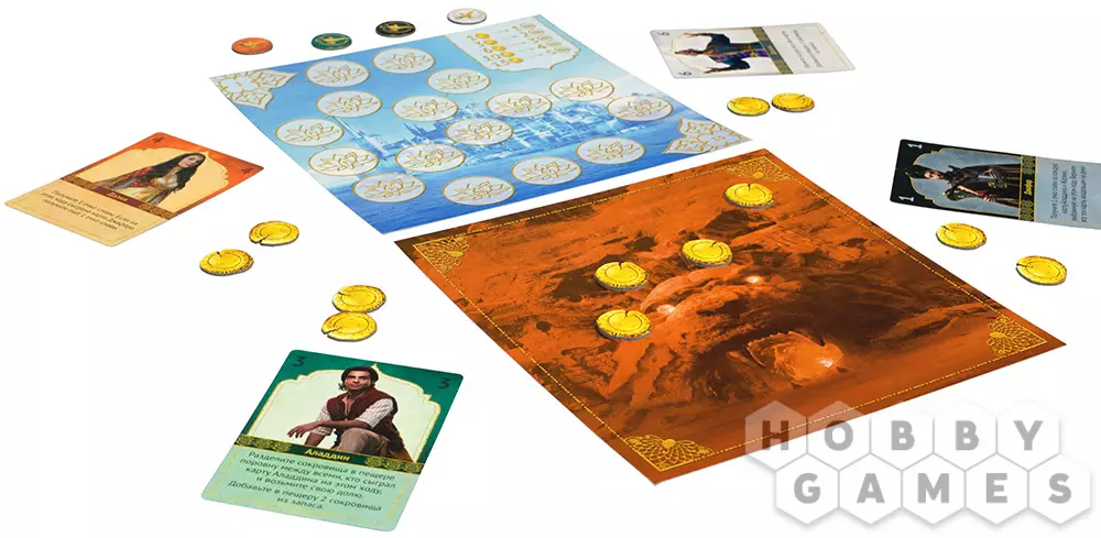 Аладдин – номер три, позволяет поделить все сокровища в пещере между всеми, кто разыграл эту карту. Также добавляет два сокровища в пещеру