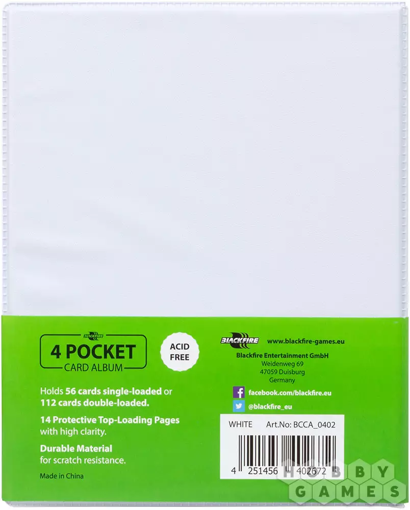 Защитите ваши карты от внешних воздействий! В этом альбоме белого цвета 14 встроенных листов, по 4 кармашка с верхней загрузкой карт на каждом. Всего в альбоме помещается 56 карт при одинарной загрузке или же 112 карт при двойной. Листы сделаны из прочного материала, не царапающего карты. А твёрдая обложка защитит как ваши карты, так и сам альбом.