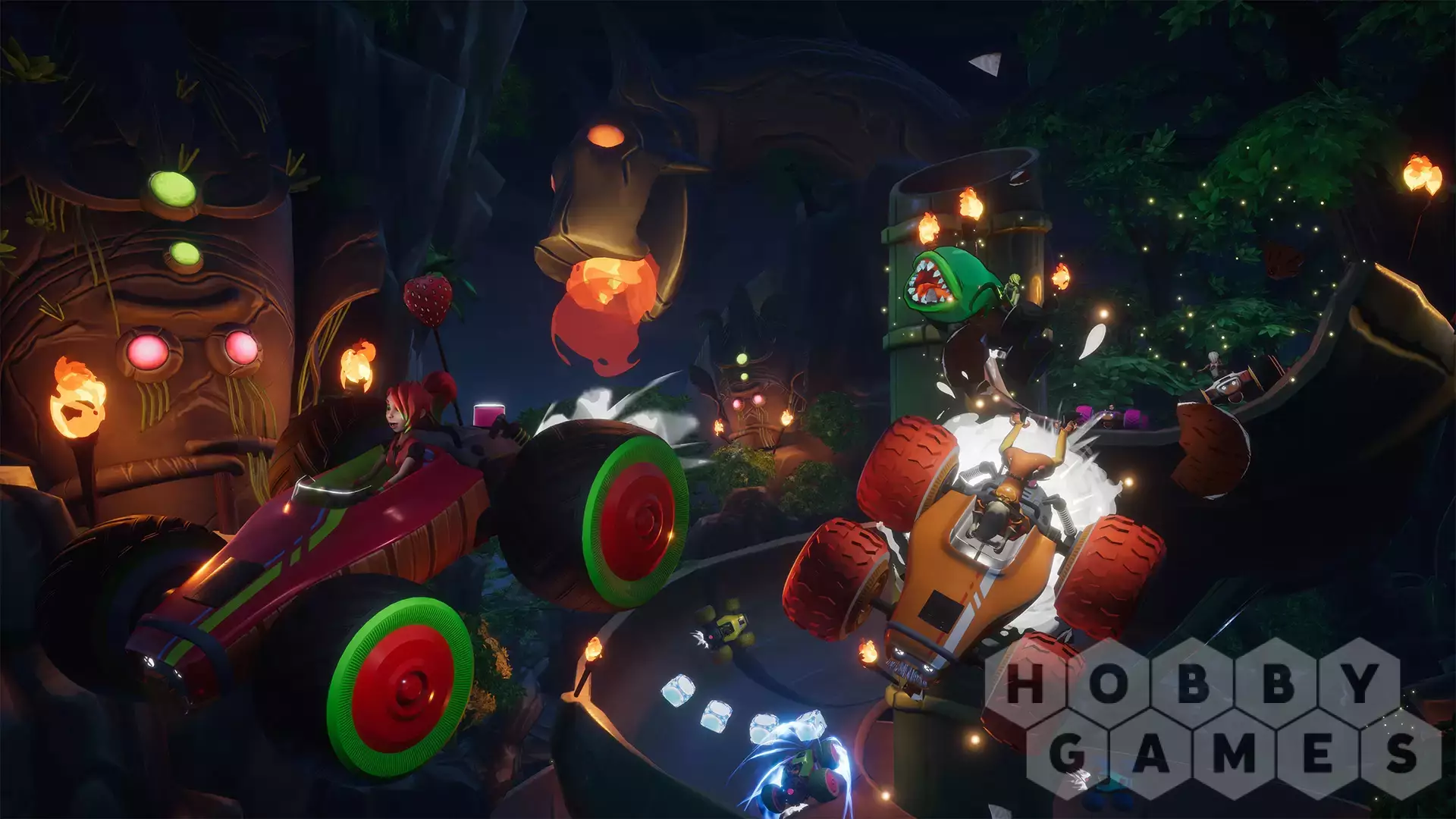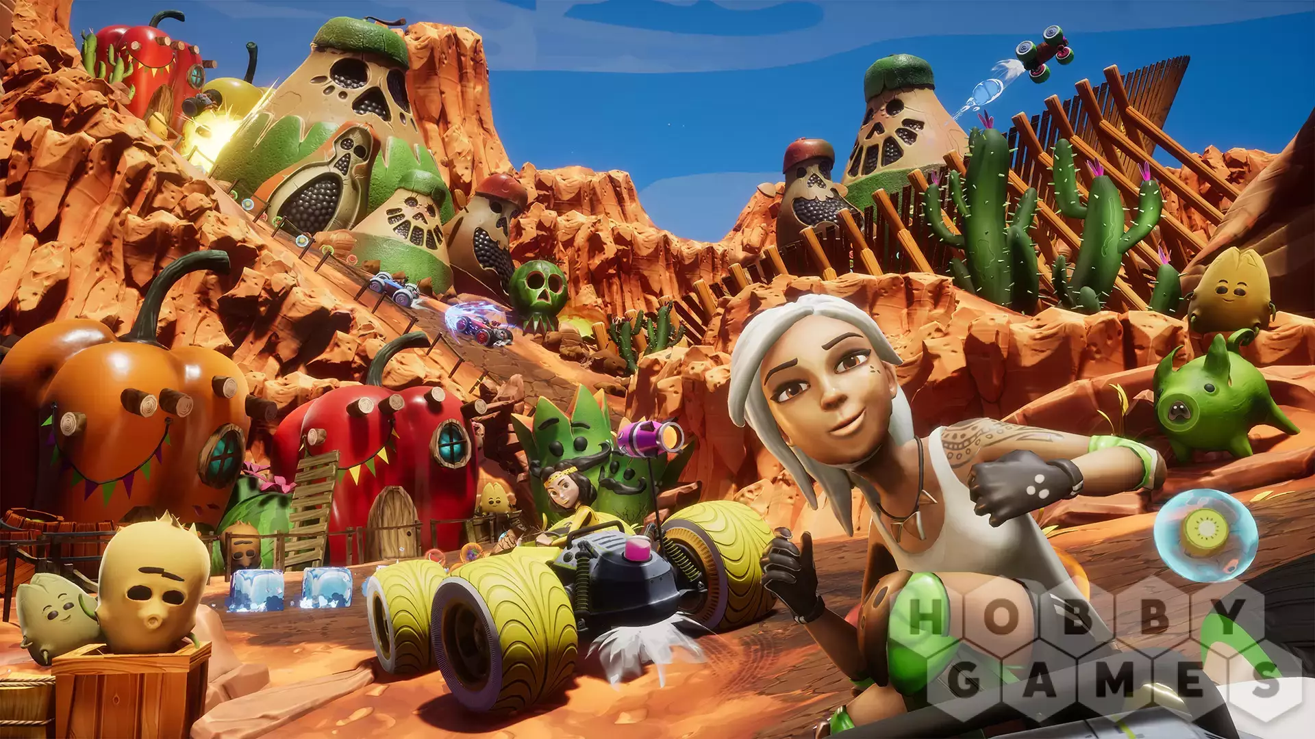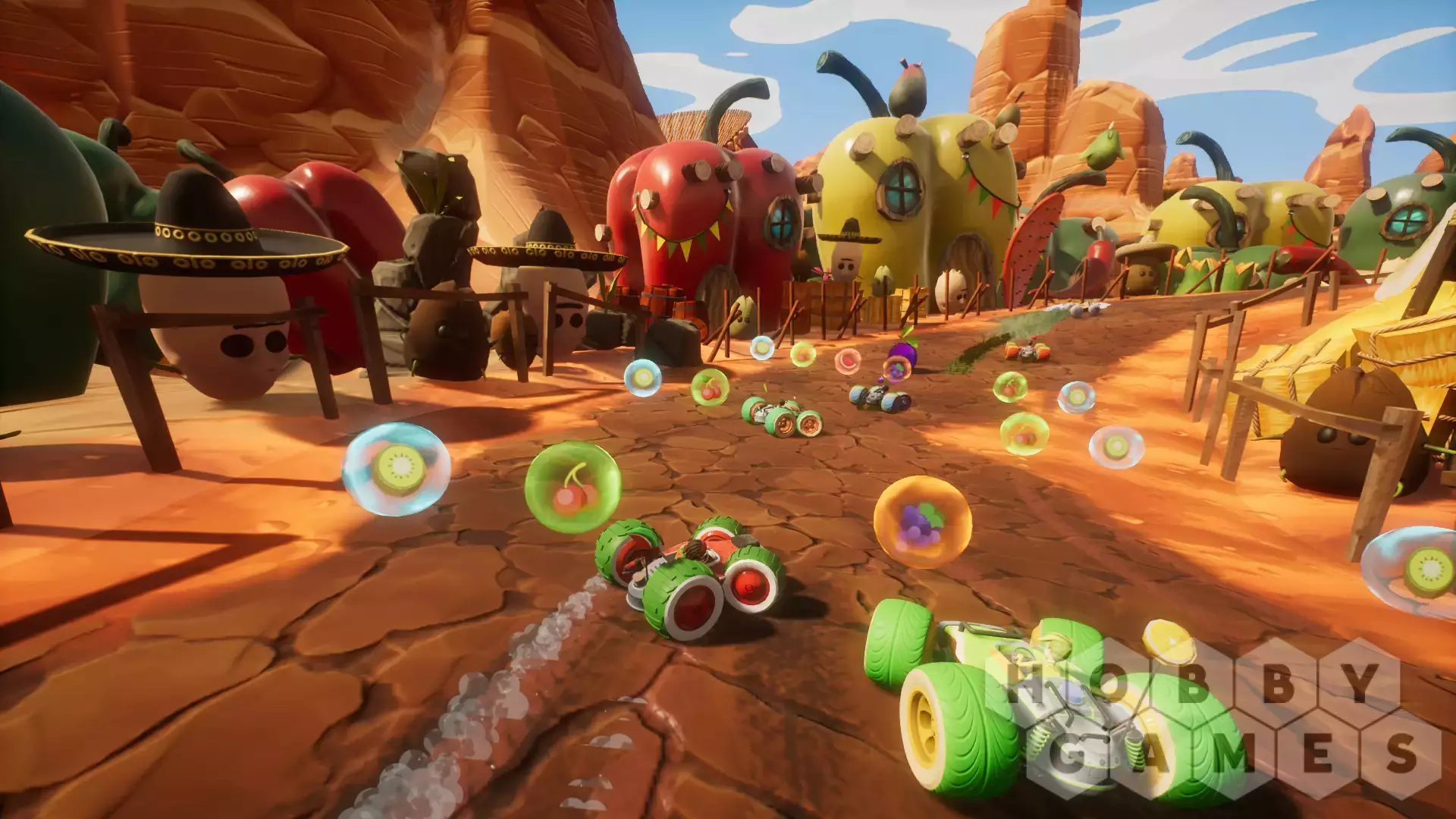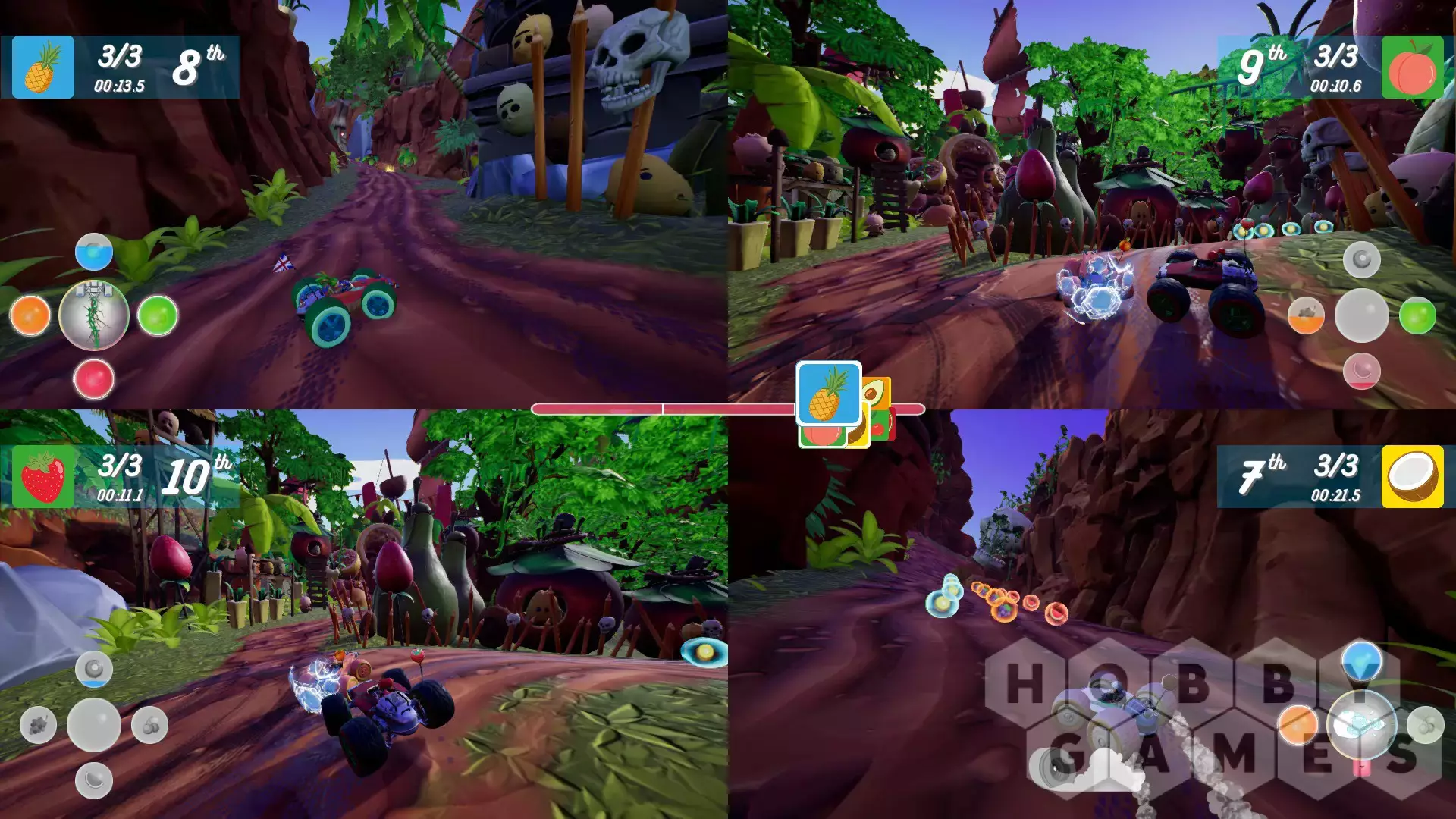 Bruise your foes (and their egos) by unleashing devastating fruit-based moves with the innovative Juicer power-up system. Collect different types of fruit as you race to fill up The Juicer's liquid tanks, then custom-combine your juice tanks' power to let loose a combo power-up. Will you let loose a volley of different power-ups, or save all of your fruit power until your unique Mega-Juice move's ready to help you reach first place?