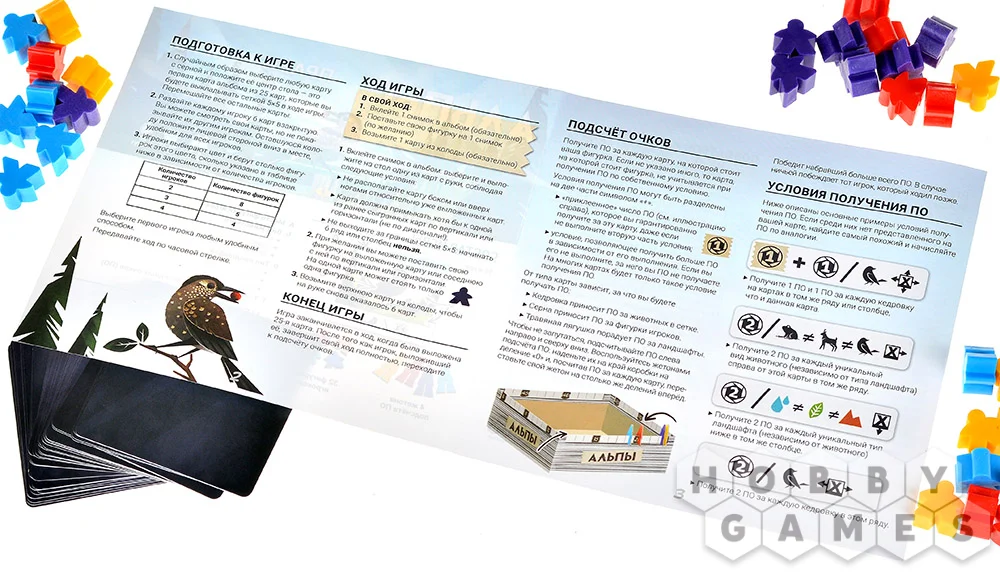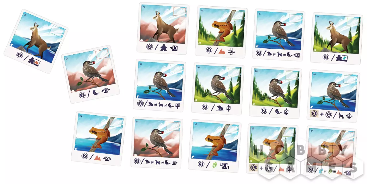 Вы будете получать очки в зависимости от того, какие животные и ландшафты изображены на картах. Так, снимки с кедровок приносят ПО за животных, серны – за фигурки игроков, а травяные лягушки – за ландшафты. На некоторых картах есть дополнительные условия: выполнив их, сможете получить ещё больше очков. Именно поэтому важно грамотно выбирать место для фигурки.