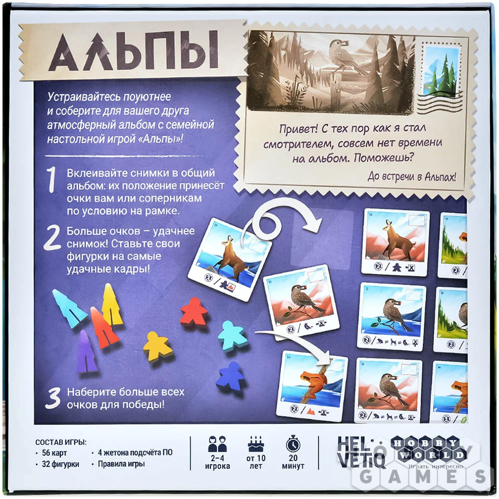 "Альпы" – это уютная семейная игра, в которой вы один или с компанией отправляетесь на фотоохоту в Швейцарский национальный парк. Ваша цель – собрать самый атмосферный альбом снимков дикой природы. Каждый ход вы будете разыгрывать карты, чтобы сделать удачный кадр и разместить его на страницах общего альбома.