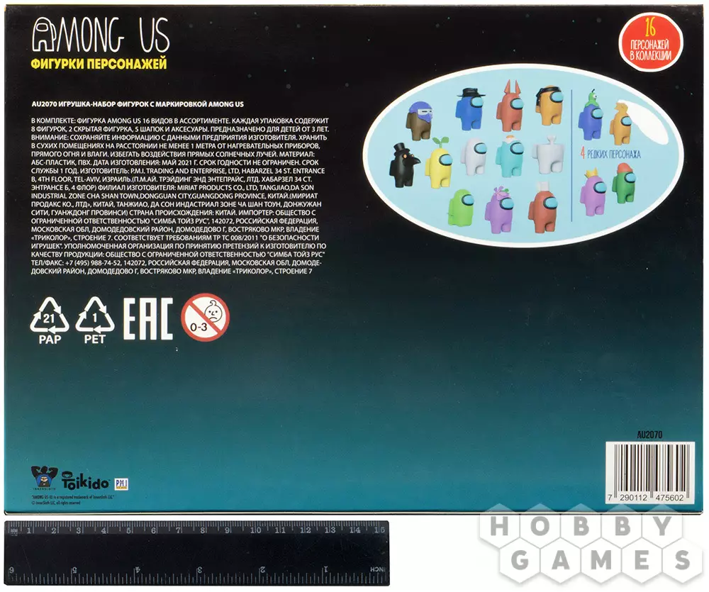 В упаковке находятся 8 фигурок по игре Among Us и несколько аксессуаров для них. А ещё в каждой упаковке они разные, что делает их ещё и предметом для коллекционирования.