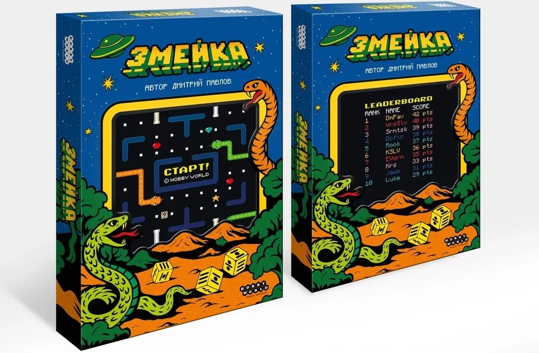 Знакомый многим с детства геймплей, но теперь в настольном формате. В коробке шесть игровых полей, которые оформлены в стиле культовых ретро-видеоигр и предлагают собственные препятствия и дополнительные возможности (в том числе искривления пространства).