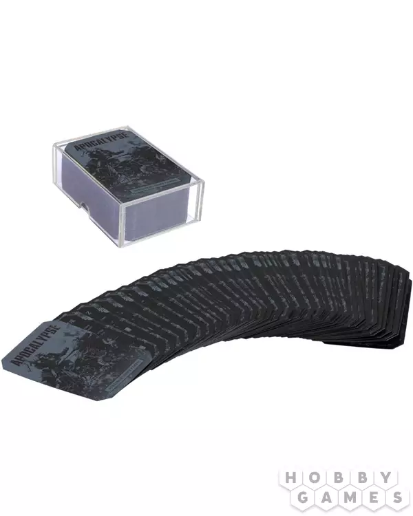 Данный набор состоит из 63 изящных черных карт, созданных специально для игр в формате Апокалипсис. Карты упакованы в прозрачную акриловую коробку, с их помощью Вы сможете отмечать и вести учет внутриигровых эффектов определенных армий и рас.