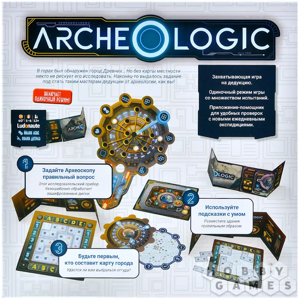 Археологика – это напряжённая дедуктивная игра-головоломка, в которой игрокам предстоит восстановить карту затерянного города, опираясь на загадочные подсказки Археоскопа. Каждая партия – это уникальный вызов: зашифрованные диски скрывают разные варианты расположения зданий, и только логика и расчёт помогут вам раскрыть их тайну. Ваше оружие – вопросы, задаваемые высокотехнологическому Археоскопу. Чем сложнее запрос, тем точнее ответ, но и тем дольше придётся его ждать своей очереди снова. Слишком простые вопросы дадут мало информации, а избыточная медлительность позволит соперникам уйти вперёд. Придётся балансировать между скоростью и точностью, анализируя каждый полученный намёк и постепенно заполняя пробелы на своей карте!