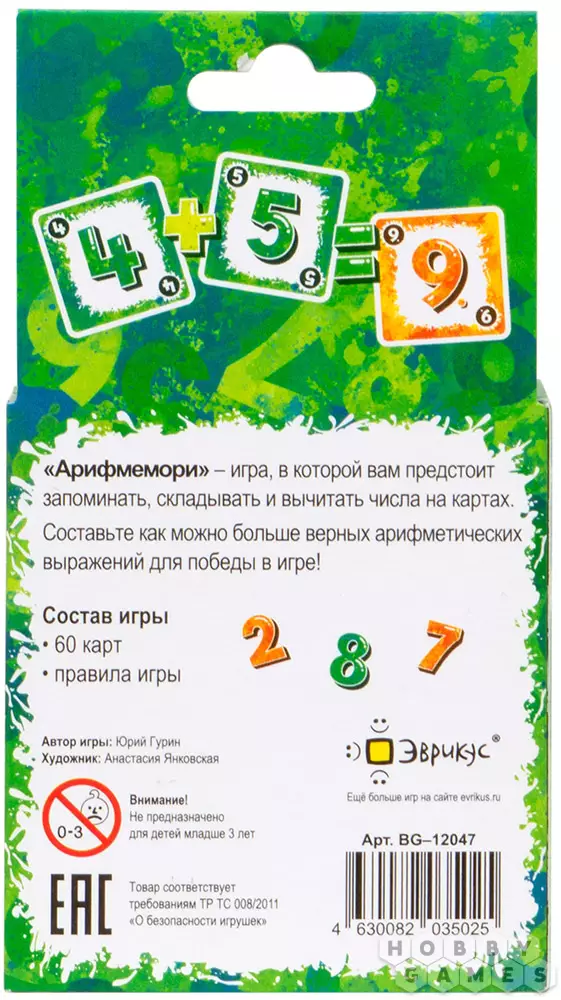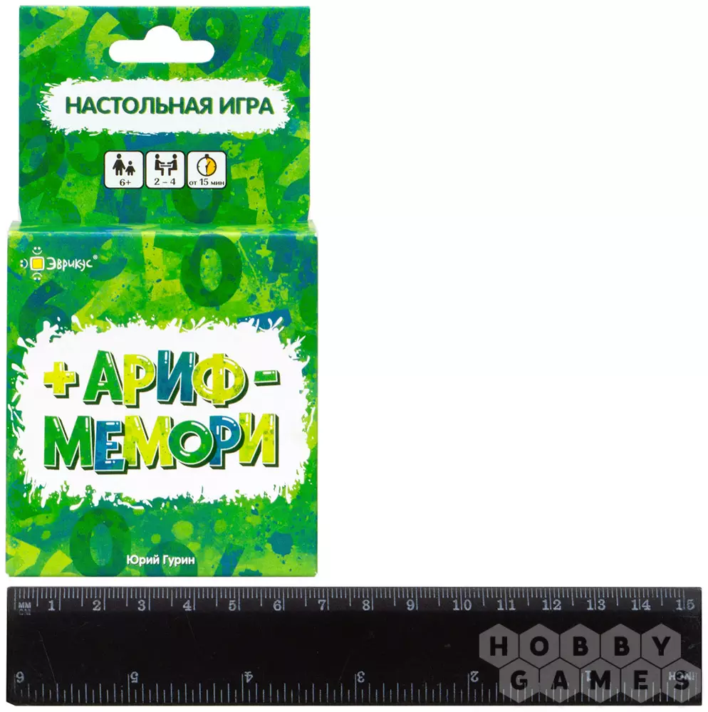 "Арифмемори" – это быстрая и простая логическая настольная игра на память и внимание. Она отлично подойдёт, чтобы развить математическое мышление у дошкольника или просто весело скоротать время с семьёй. В отличие от простого "Мемори", в арифметической версии вам надо будет не только запоминать значения на карточках c числами, но и складывать и вычитать их друг из друга. Чтобы победить, игрокам нужно составлять верные математические равенства: если с помощью сложения или вычитания из карточек с числами можно получить значение карточки с результатом, вы забираете этот результат себе – и игрок с наибольшим количеством верных результатов побеждает.
