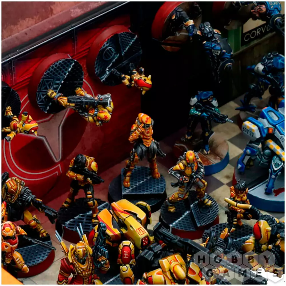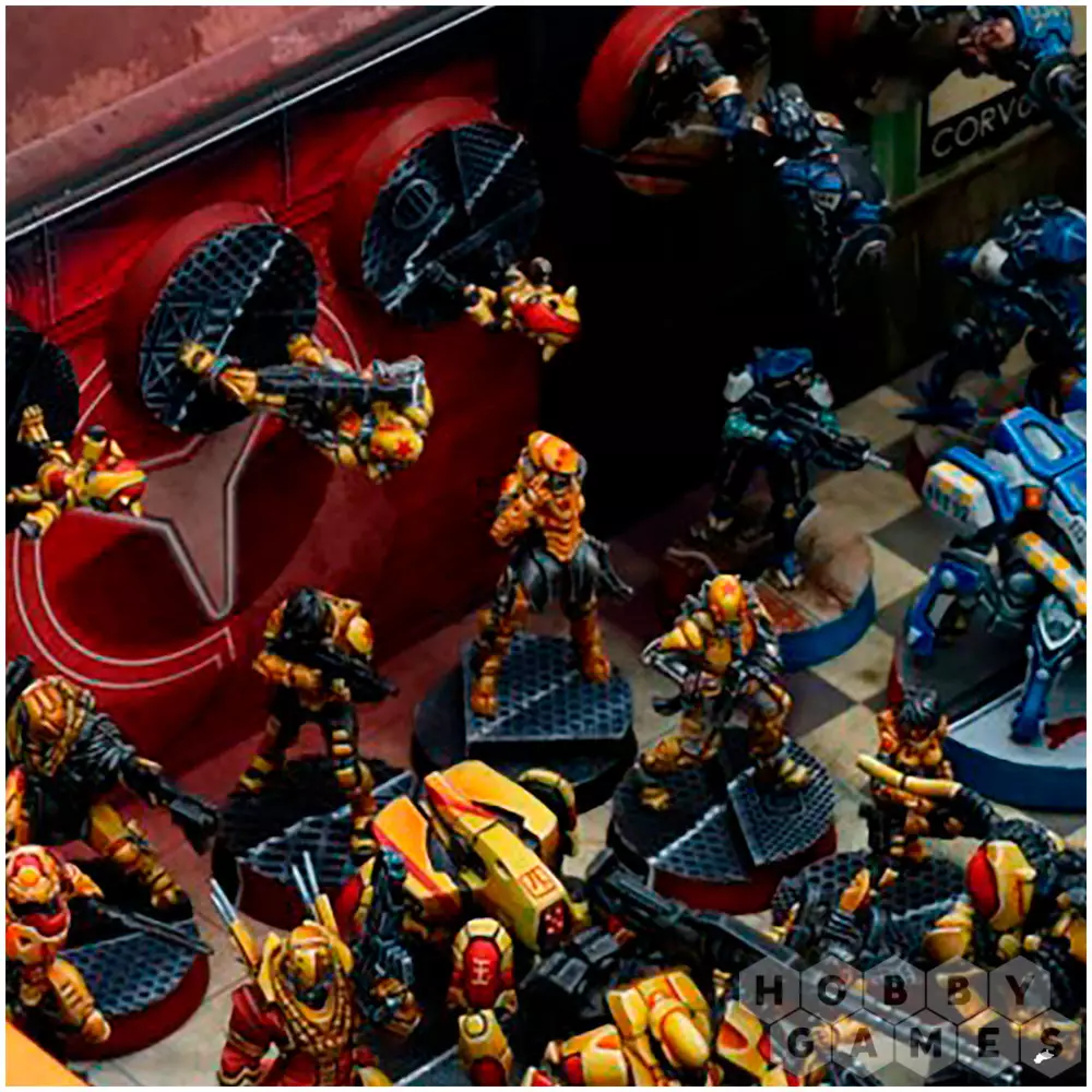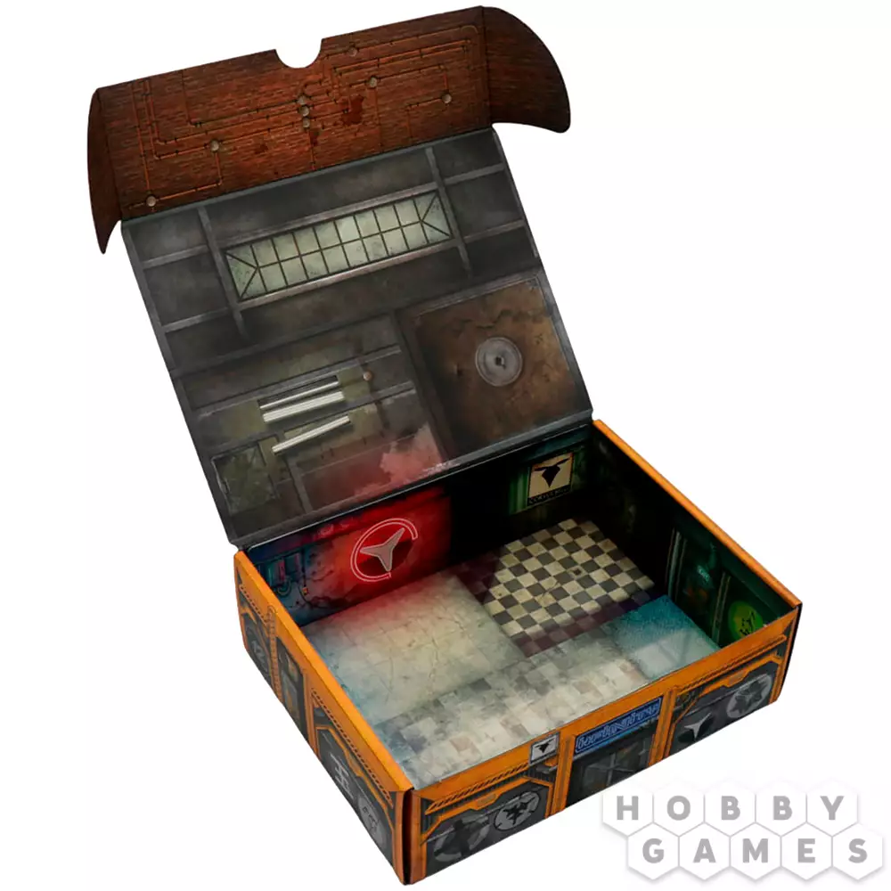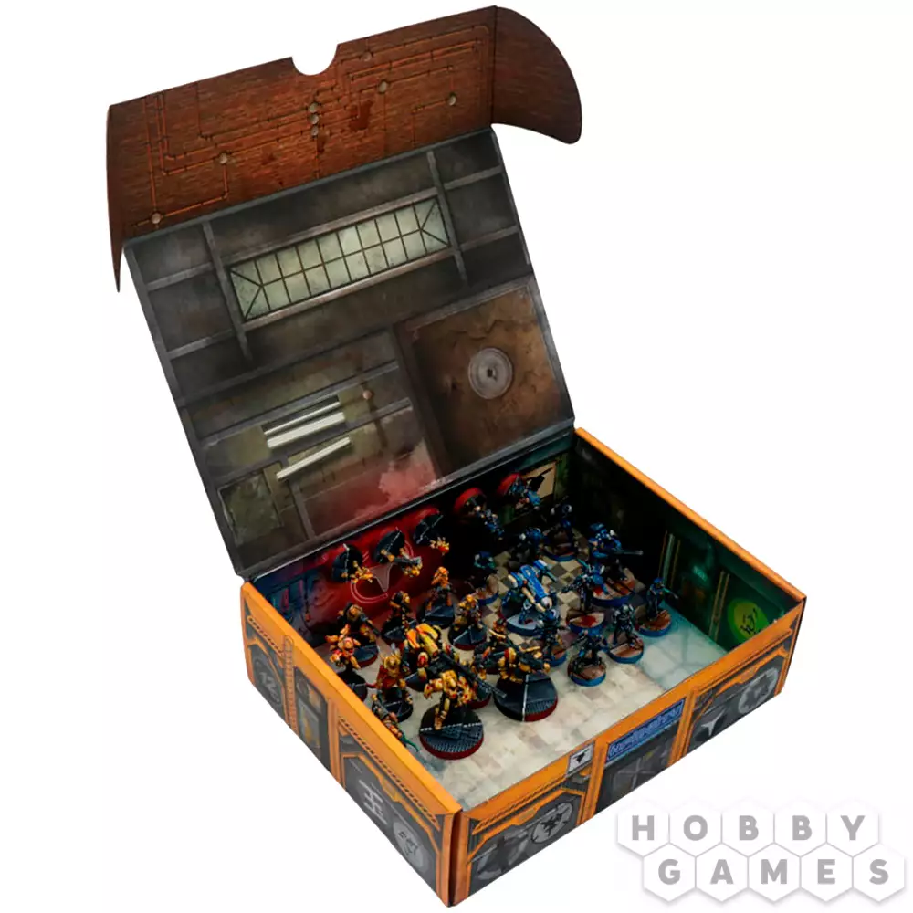 Infinity – динамичная тактическая игра, которая великолепно использует элементы декора поля боя. Данная коробка была создана не только как безопасное место для ваших миниатюр, но и как часть боевых действий на поле. Её графический дизайн, выполненный в стиле заброшенного бара, был задуман так, чтобы коробка могла также использоваться как элемент декора для поля боя. Более того, сама игра может переместиться в интерьер коробки через напечатанные двери, люки и лестницы. Чтобы сделать игру ещё более увлекательной, коробка оснащена картонным вкладышем, формирующим внутренние стены, а также дополнительным элементом в виде контейнера, который можно разместить на её крыше.