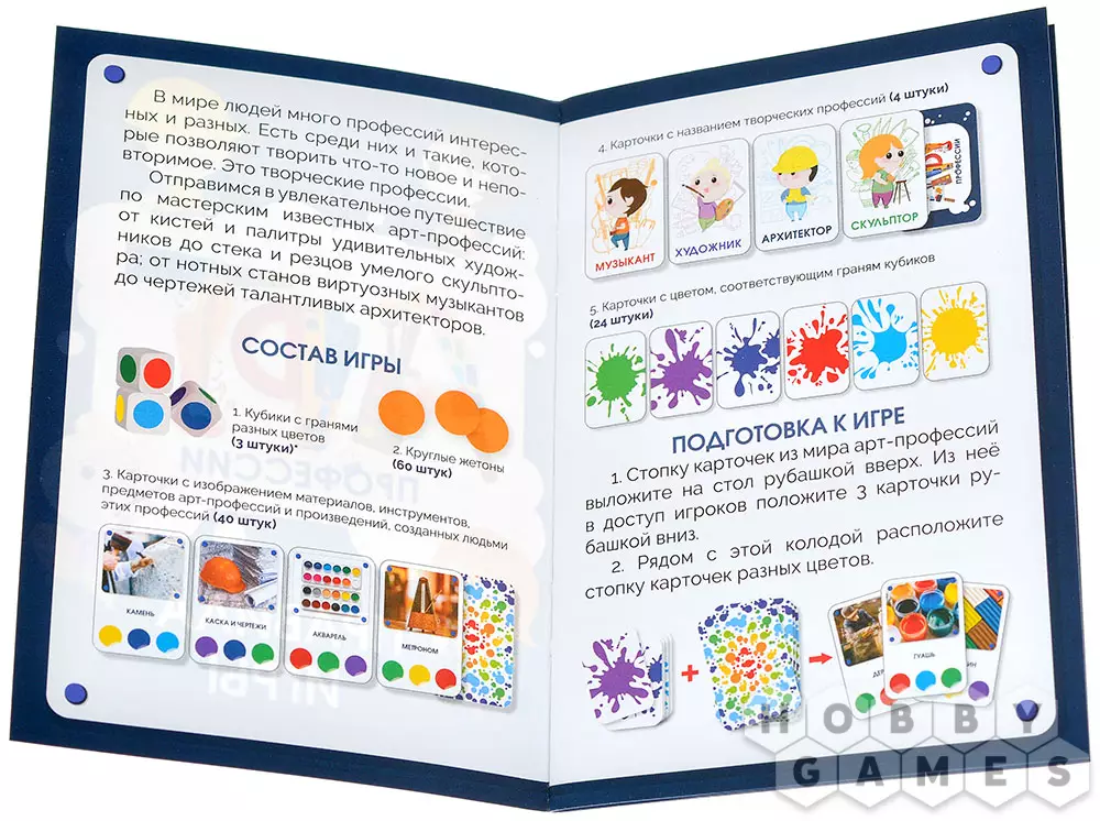 "АРТ-профессии" – это увлекательный способ провести время с пользой, узнать много нового о мире искусства и, возможно, найти вдохновение для создания собственных шедевров. А цель предельно проста: нужно первым собрать пять карточек, на которых изображены инструменты, материалы, предметы или готовые произведения, относящиеся к одной из творческих специальностей. Кто быстрее соберёт полную коллекцию – тот и победил!