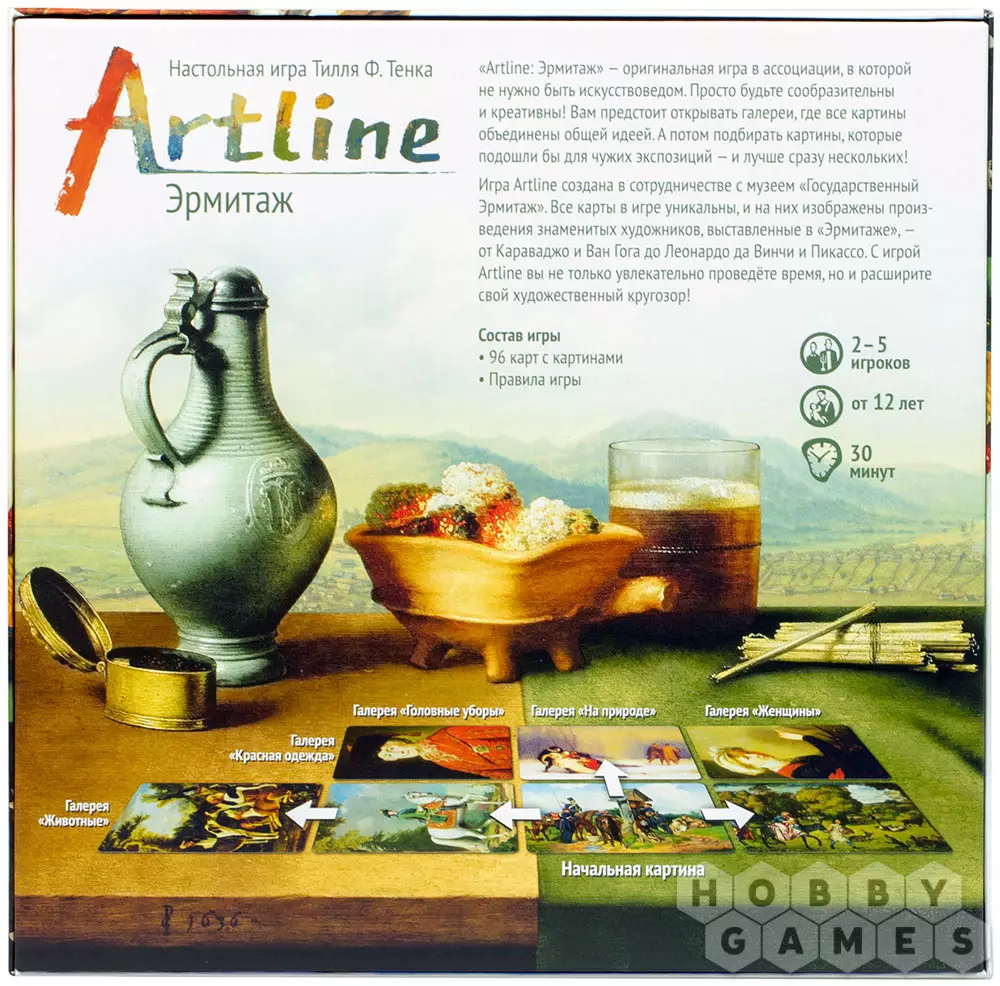 "Artline: Эрмитаж" – простая в освоении карточная игра, которая взяла за основу тему изобразительного искусства и мировые шедевры величайших художников. Рембрандт и Караваджо, Ван Гог и Пикассо – у нас есть всё! Важнейшей частью игры являются карты с иллюстрациями картин и справочной информацией для знакомства с прекрасным.