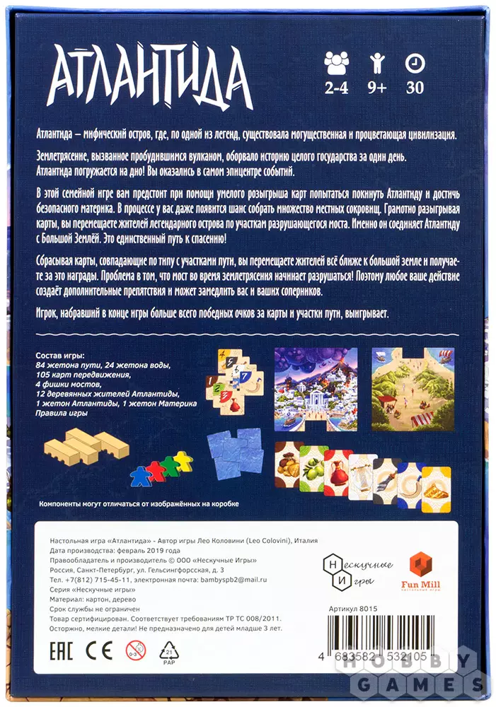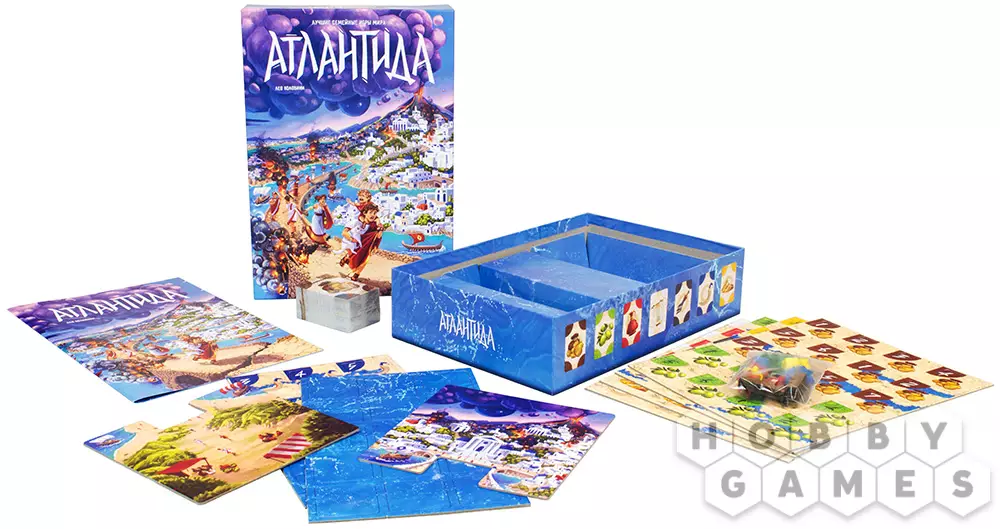 "Атлантида" – это забавная и тактическая игра для всей семьи, в которой найдётся место и непрямой конфронтации между игроками. Главная цель – доставить трёх человечков одного цвета до места назначения при помощи специальных карт движения и попутно собрать как можно больше сокровищ.