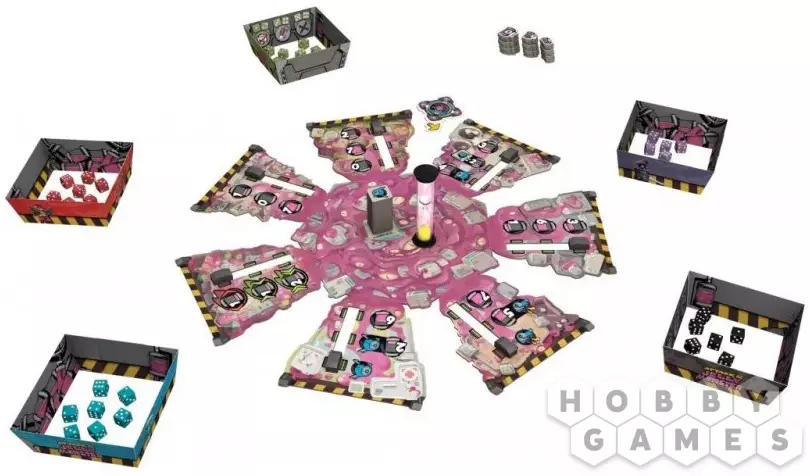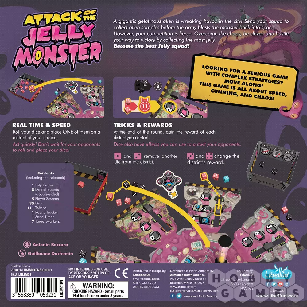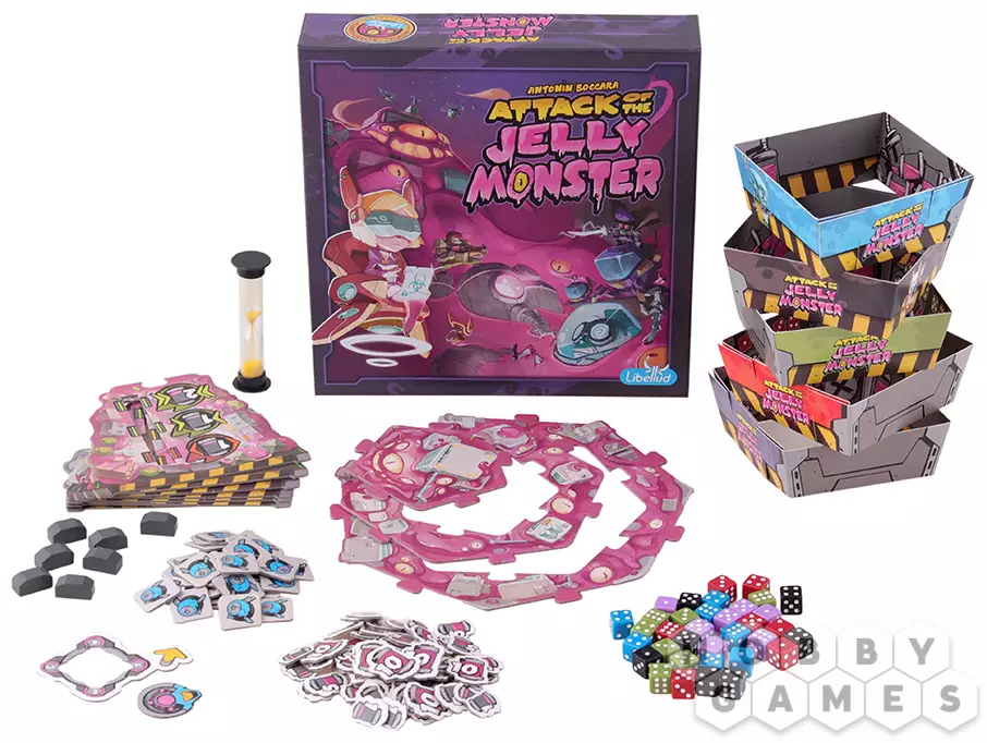 Attack of the Jelly Monster – это хаотичная и весёлая тактическая игра, где игроки одновременно бросают кубики и размещают их в разных районах города, пытаясь захватить контроль. Каждый кубик – это ваш боец, а его значение – сила отряда. Но будьте осторожны: только тот, кто наберёт наибольшую сумму в районе, получит заветное желе! А ещё у кубиков есть особые способности, которые можно использовать в самый подходящий момент. Здесь важны и скорость, и расчёт – ведь противники действуют одновременно и могут перехватить победу у вас из-под носа! Готовы ли вы бросить вызов желеобразному хаосу?