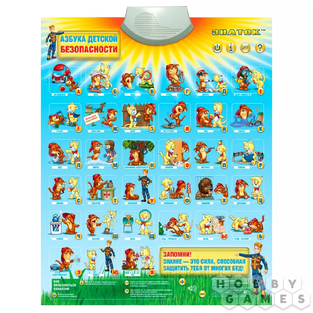 "Азбука детской безопасности" – уникальный обучающий плакат, разработанный совместно с МЧС РФ. На нём вы найдёте буквы алфавита с электронными кнопками, при нажатии на которые вам будут озвучены различные потенциально опасные ситуации из жизни детей и способы их предотвращения. Голосовые советы очень лаконичны и легко запоминаются. Каждой ситуации соответствует иллюстрация с забавными персонажами, дополнительно способствующими запоминанию.