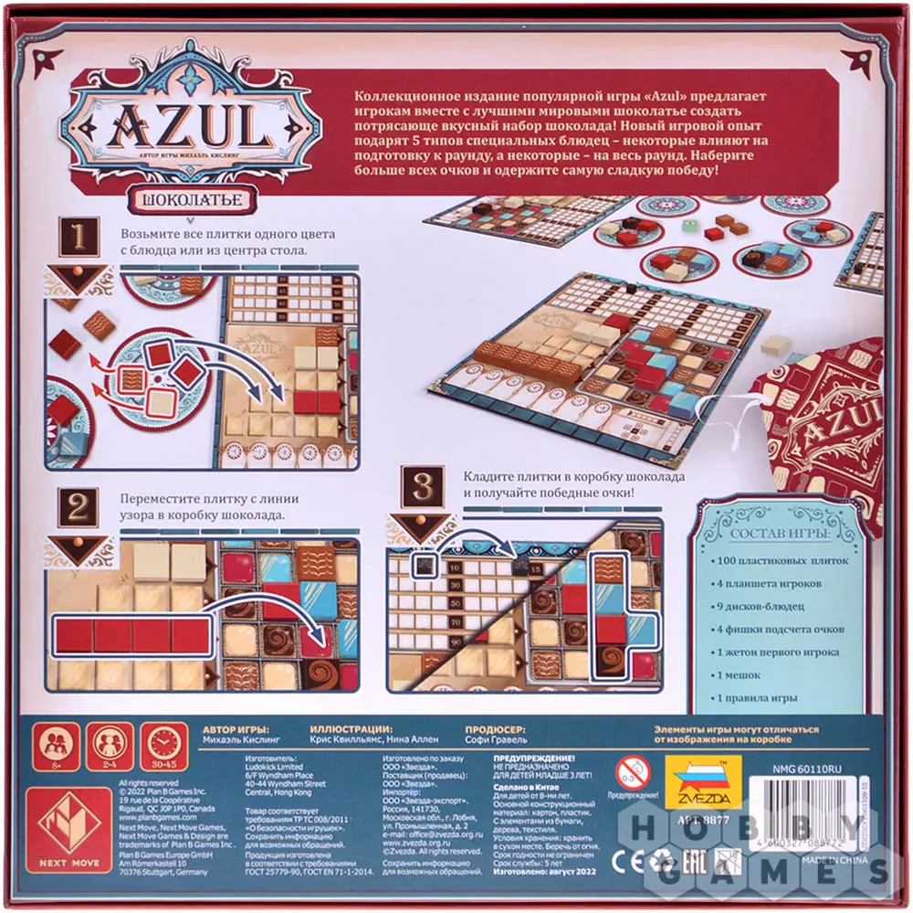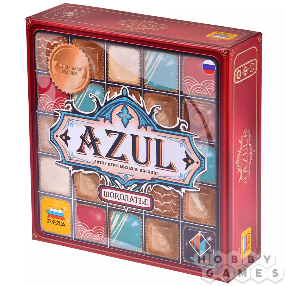 "Азул: Шоколатье" – это уже пятая игра в серии, если считать её среди самостоятельных "коробок". На самом же деле это специальное издание с теми же самыми правилами и игровым процессом, которые полюбились игрокам самого первого "Азула". Но помимо изменённого дизайна в игре появились специальные диски-блюдца, обладающие своими особыми эффектами, которые способны повлиять как на подготовку к игре, так и на всю партию в целом.