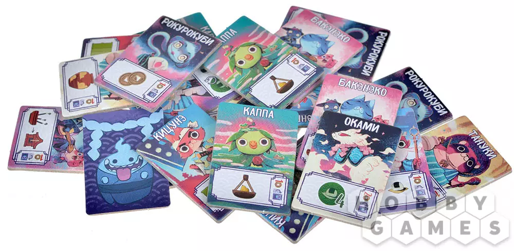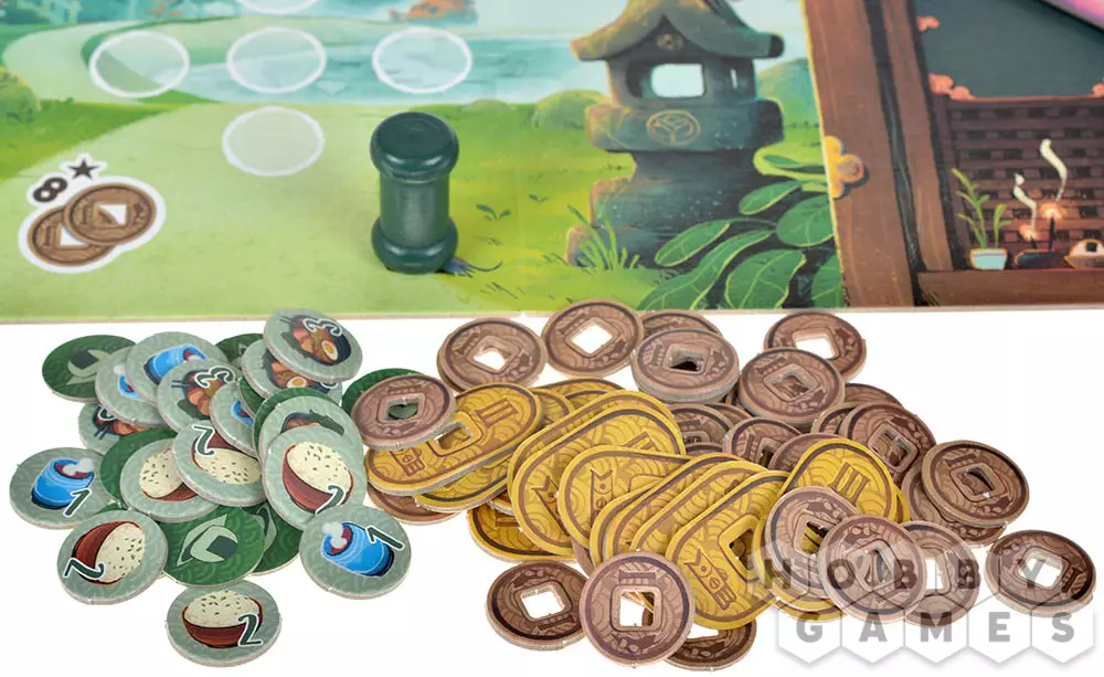 Подготовьте игровое поле: присоедините к его левой нижней части деталь с прорезями, в которые в случайном порядке поместите 12 фишек ростков бамбука с символом . Затем выложите из общего запаса 5 случайных жетонов еды в центр игрового поля, а жетоны гармонии и жетоны дома разделите на несколько стопок по символам. Перемешайте жетоны духов, разделите их на 4 стопки по 4 жетона и поместите каждую в один из четырёх храмов на игровом поле. Игроки получают личный планшет дома, все компоненты своего цвета, один случайный жетон гармонии, 4 фишки ростков бамбука разных цветов и 3 монеты. Можем начинать!