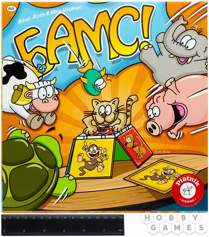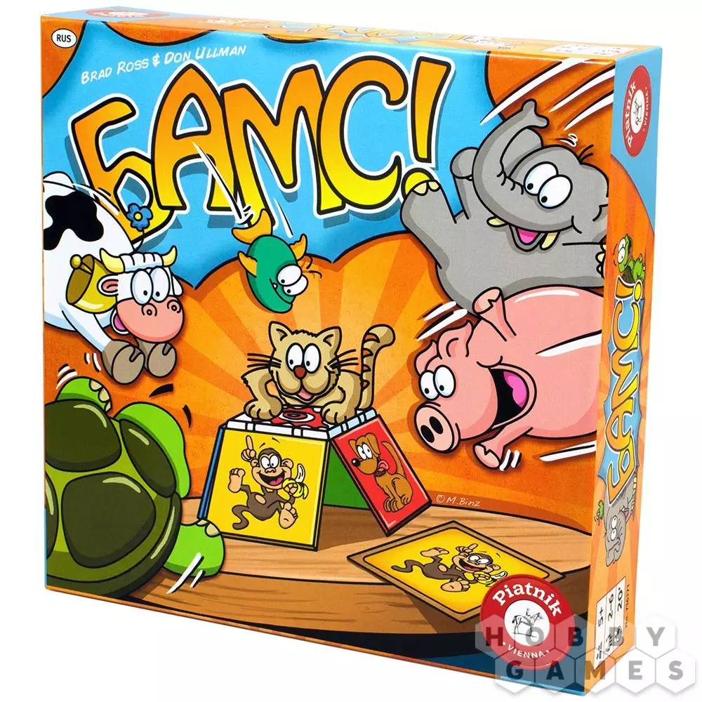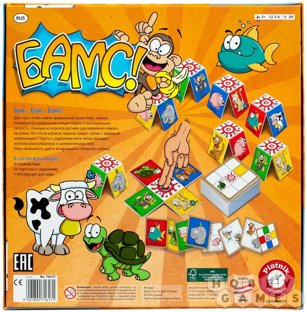 В игре "Бамс!" необычные кубики. Эти игральные кости не катаются по столу, а прыгают. Так происходит потому что в игре используются пятисторонние объекты, в которых четыре стороны присоединены к пятой, а чтобы получить результат, вам нужно надавить на них, а когда вы их отпустите, они забавно отпружинят обратно. Зачем это делать? У каждого игрока есть карточка с заданием. Иногда нужно найти на кубике верную комбинацию – иногда это животное, иногда цвет, а порой и то и другое! Но "бамсать" надо одновременно, так, чтобы сошлось ваше условие на карте. Победитель в раунде забирает карточку себе. Первый, кто соберёт пять карт, выиграет.