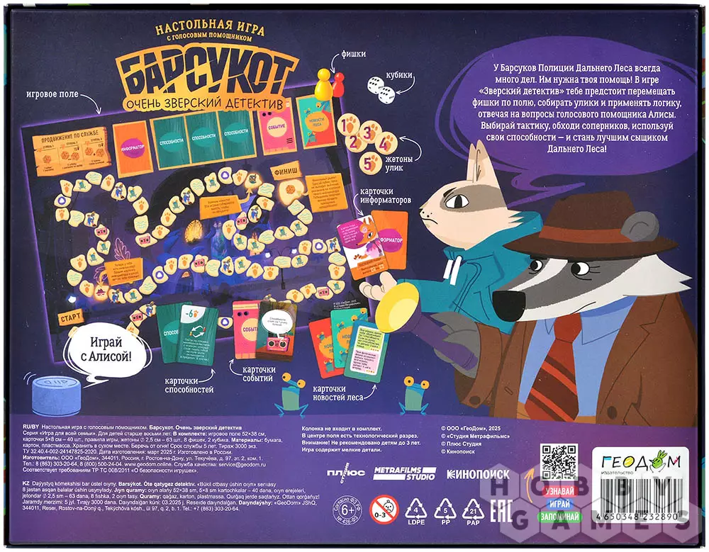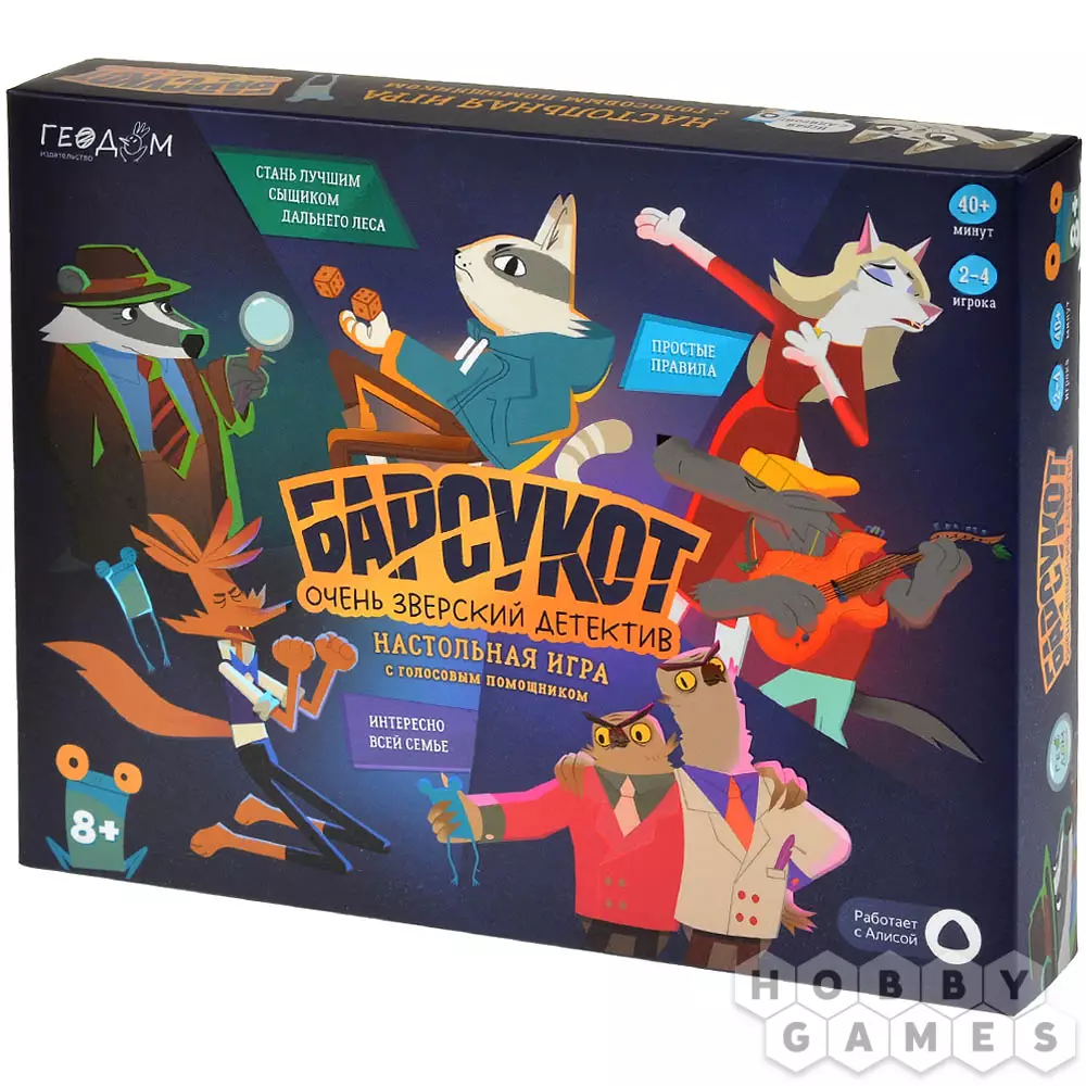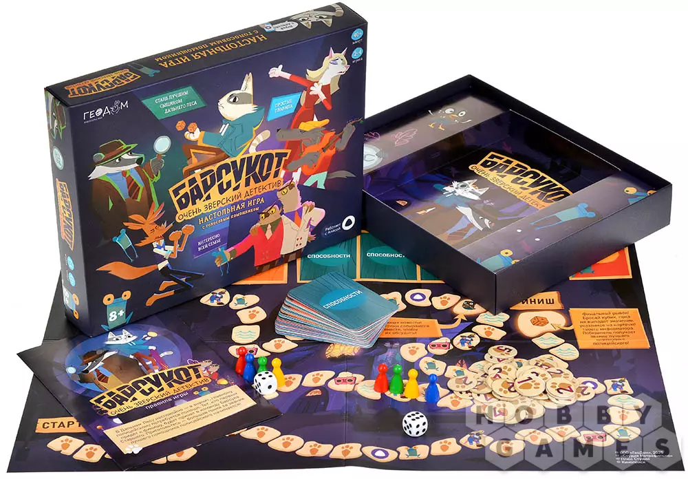 Вас ждёт зверски увлекательное расследование, в котором животные ведут себя вовсе не как милые пушистики. Добро пожаловать в лес, где произошло нечто подозрительное – и только вы, команда самых отважных сыщиков, сможете распутать это дело! В настольной игре "Барсукот: Очень зверский детектив" вы окажетесь в самом центре криминального сюжета... Исследуйте локации, собирайте улики, бросайте кубики, перемещайтесь по полю и следите за тем, чтобы ни одна зацепка не ускользнула из вашего внимания.