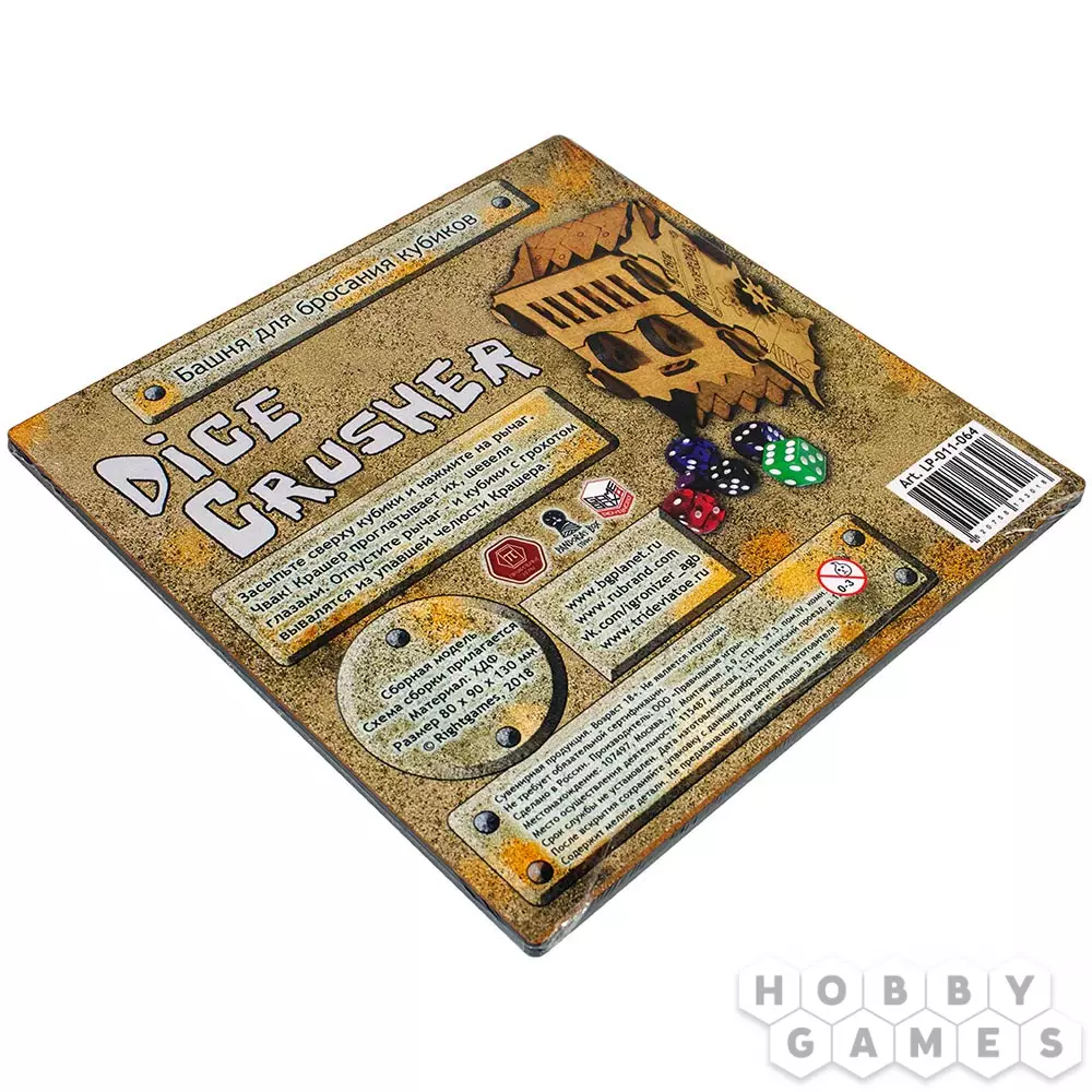 Перед вами башня Dice Crusher, которая сделает результат броска кубиков абсолютно случайным. Бросьте кубики сверху и нажмите на рычаг. Чвак! Сокрушитель проглатывает кубики, шевеля своими глазами. Отпустите рычаг – ваши кубики с грохотом вывалятся из упавшей челюсти грозного Сокрушителя. Можете не переживать за судьбу ваших кубиков, ведь Сокрушитель только на вид страшный, в остальном он просто делает свою работу, а именно – хорошенько перемешивает попавшие в него кубики. Благодаря вместительности башни, в неё можно поместить до десяти игральных костей.