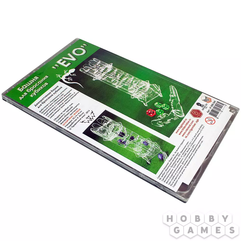 Башня изготовлена из прозрачного акрила, что позволяет увидеть, что же творится с вашими кубиками во время броска в её судьбоносных недрах.