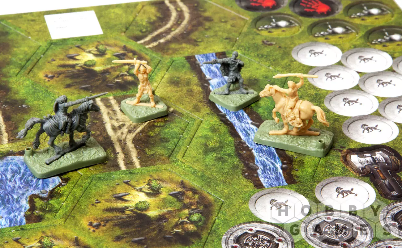 Также "Битвы Вестероса" могут похвалиться высоким уровнем реализма, который помогает вам погрузиться в антураж Войны Пяти Королей. На подставке каждого вашего юнита, будь то пеший или конный воин, лучник или псарь, есть гнездо для древка - в него вставляются пластиковые вымпелы с гербами Домов. Расположение знамени на древке позволяет понять, отдали вы приказ данному отряду или нет. Помимо этой помощи в отделении активированных подразделений от тех, кто еще не действовал, сам вид армии под развевающимися знаменами на поле брани крайне внушителен. Станьте многоопытным лордом Бобрового Утеса Тайвином Ланнистером или пылким Роббом Старком, хозяином лютоволка по имени Серый Ветер!