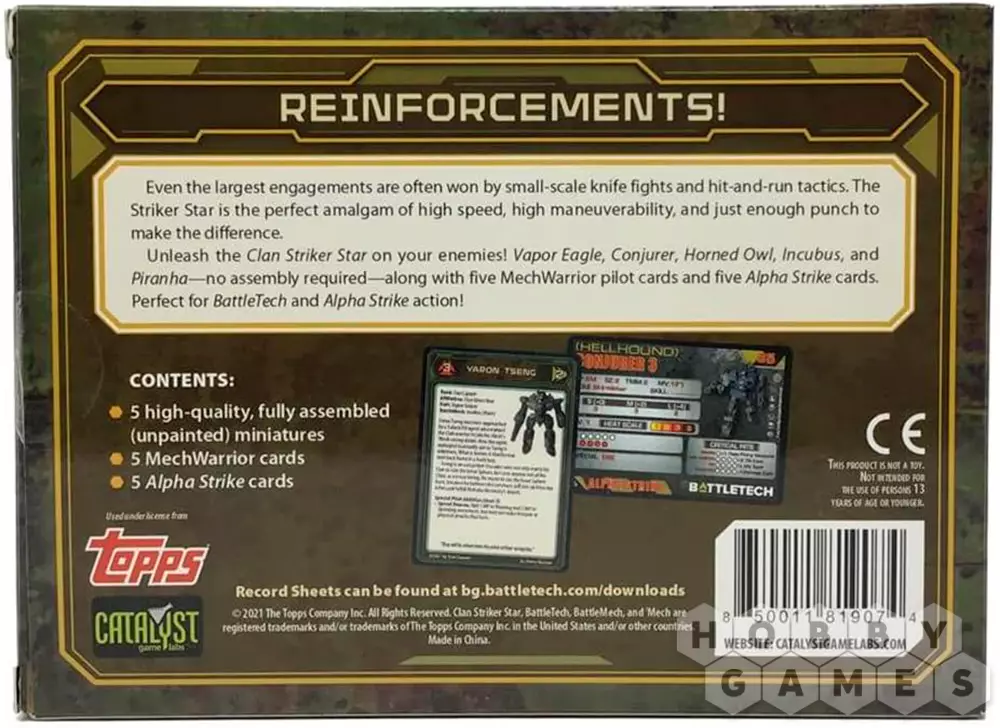 Каждый Клановый набор Star Force содержит пять высококачественных, полностью собранных OmniMechs или BattleMechs, а также пять карт "Альфа-удар" и пять карт пилота.
