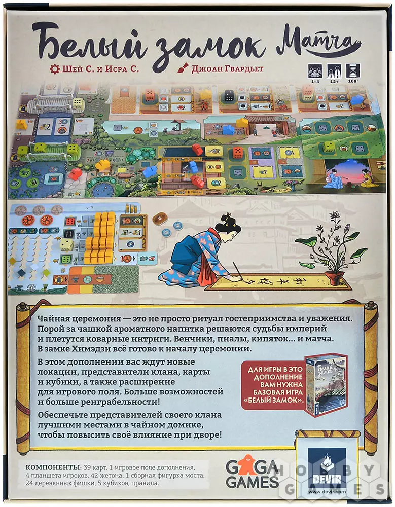 "Белый замок: Матча" – это дополнение к "Белому замку", которое привнесёт в игровую механику церемонию, посвящённую чаю, и откроет новые стратегические возможности. Чтобы заслужить уважение даймё Химэдзи, одной армии недостаточно – понадобится освоить искусство заваривания матчи. Теперь с помощью особых зелёных кубиков и венчика вы сможете занять – как минимум попытаться – лучшие места в чайном домике и укрепить своё влияни в регионе! А если настроение будет лиричное, всегда можно просто посидеть у красивого пруда, помедитировать и накопить ресурсов для будущих свершений.