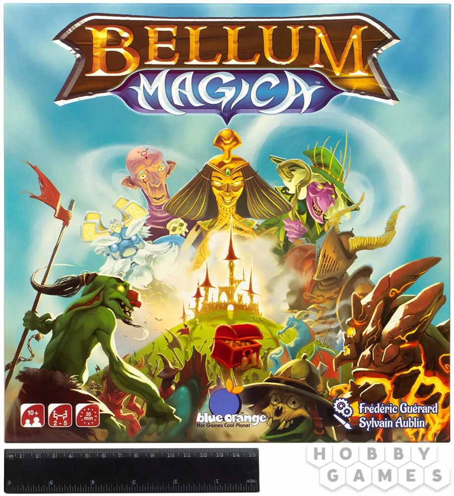 Настольная игра Bellum Magica – это простая стратегическая карточная игра, в которой каждый из игроков берёт на себя роль Тёмного владыки. У вас есть свой замок и орда злобных существ, которая каждый раунд будет приносить ресурсы и атаковать деревни жителей, а также, если вы пожелаете, может напасть на замок другого игрока. Цель игры проста: вы должны награбить как можно больше сундуков с сокровищами. В начале игры всем раздаются по 2 карты гоблинов, у каждой из которых есть по 2 способности: слева добыча ресурсов, справа – атака и оборона. Вы должны расположить полученные карты по бокам от своего замка в зависимости от того, какие способности гоблинов вы хотите использовать. Далее броском кубика определяется, какая орда будет активна в текущем раунде. После этого все игроки ходят по очереди: сначала собираются ресурсы, затем подсчитываются собранные разведчиками карты с сокровищами – у кого из игроков больше, тот получает сундук. Затем в порядке очереди все игроки предпринимают по одной атаке: либо напасть на деревню, либо на другого игрока. После атаки игроки могут нанять новых существ в свою армию (за ресурсы само собой). Игра заканчивается, когда один из игроков собирает 10 сундуков. Но это вовсе не значит, что он победил; ценность у всех сундуков разная, она указана на обратной стороне жетона, которая закрыта от остальных игроков (кроме вас). Вы подсчитываете именно ценность. У кого получилась сумма больше всех, тот и становится самым богатым Тёмным лордом!