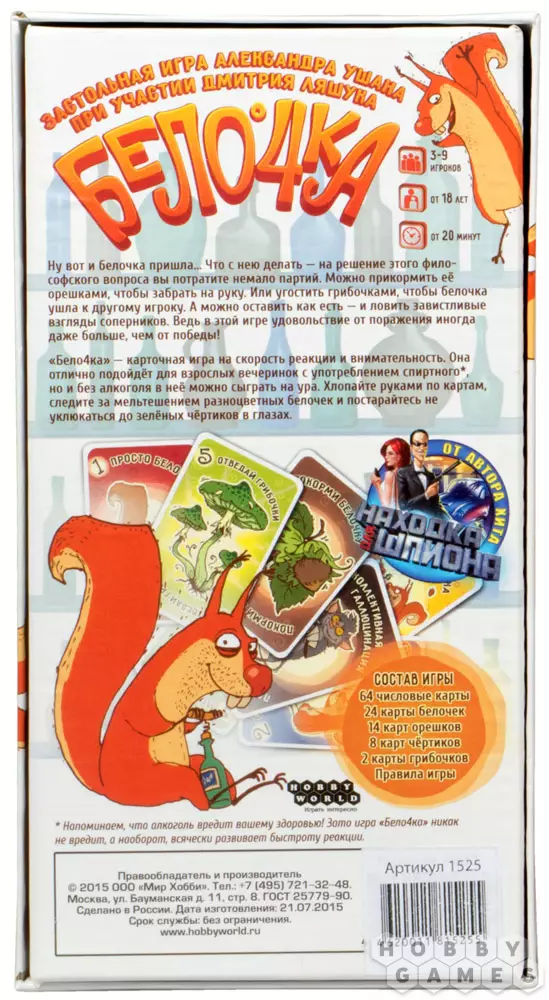Докатились, вот и нас посетила «белочка»… Что с нею делать? Вечный вопрос, на решение которого вы потратите немало усилий, горячительного и игровых партий. Можно прикормить её орешками, чтобы забрать в свою руку. Можно угостить грибочками, чтобы «белочка» перешла к другому игроку. А можно оставить всё как есть и просто ловить завистливые взгляды соперников, ведь в этой игре для взрослых от поражения иногда можно получить даже больше удовольствия, чем от победы!