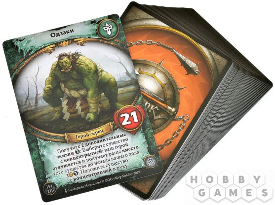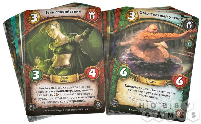 Весь игровой процесс, как вы уже поняли, строится на картах. В своей колоде вы должны иметь одну карту героя, которая является вашим альтер эго в игре, обладает определённым запасом жизни, способностью и стихией. Всего стихий пять: степи, горы, лес, болота, тьма. Карты без стихии – нейтральные. Помимо карты героя, в колоде вы можете иметь от 40 карт той стихии, к которой принадлежит ваш герой, но не более трёх копий одной и той же карты.