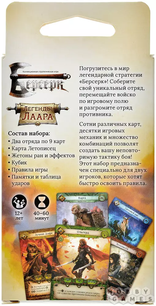 "Легенды Лаара" создан специально для новых игроков, желающих быстро освоить правила и сыграть первые партии в классический "Берсерк". В составе набора вы найдёте 2 заранее подготовленных отряда, которые отлично сбалансированы и состоят из абсолютно новых карт с простыми, но интересными механиками. А самое главное – всех их можно использовать наряду с другими картами выпусков "Война стихий" и "Нашествия тьмы".